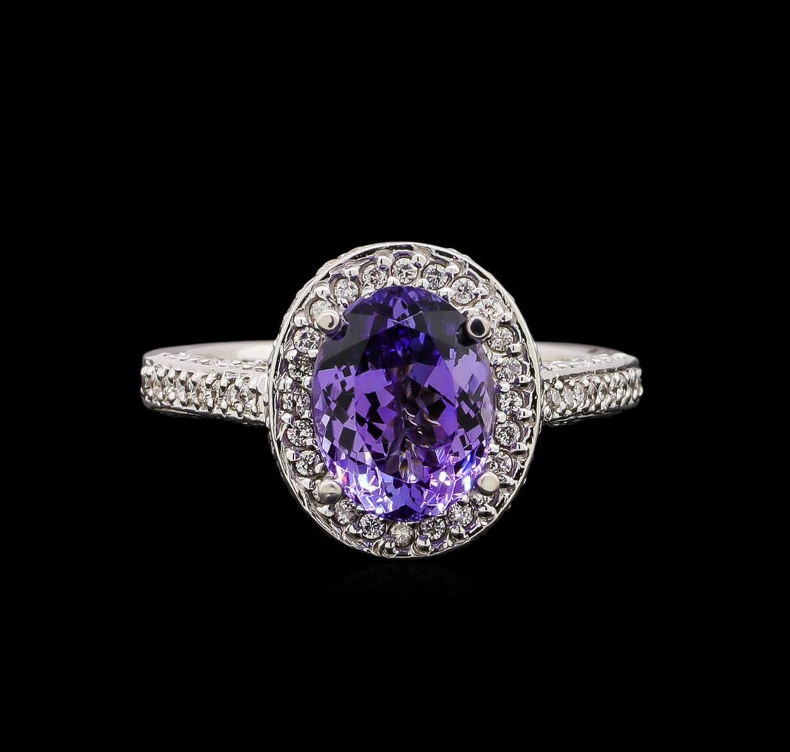 One electronically tested 14KT white gold ladies cast tanzanite and diamond ring with a bright polish finish. Identified with markings of "14K". Condition is new. Containing: One prong set oval modified brilliant cut natural tanzanite, measuring 9.70 x 7.60 x 4.56mm, approximate weight of 2.36ct., clarity is eye clean, type I, medium light, very slightly grayish, violet color, (GIA V 4/3), cut is good. One Hundred Seventy-Two prong set round brilliant cut diamonds, measuring 1.20 - 1.20 x 0.72mm (depth est.) approximate total weight of 172 Stones = 1.08ct. Clarity: SI-2 to I-1. Color: H - I, Cut is Good. Colored gemstones are presumed to have been subjected to commonly used enhancement processes. All diamonds and colored gemstones are graded in the mounting, unless otherwise stated. Total Weight of Colored Stones 2.36ct. Total Weight of Diamonds 1.08ct. Total Weight of Ring 5.70 grams. GGL Appraised at $4,030.00.