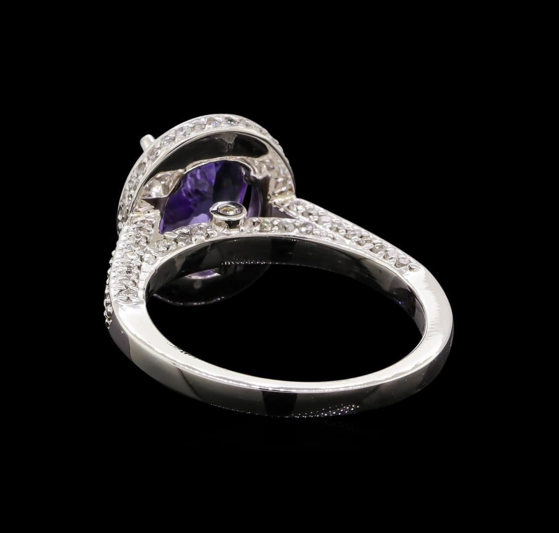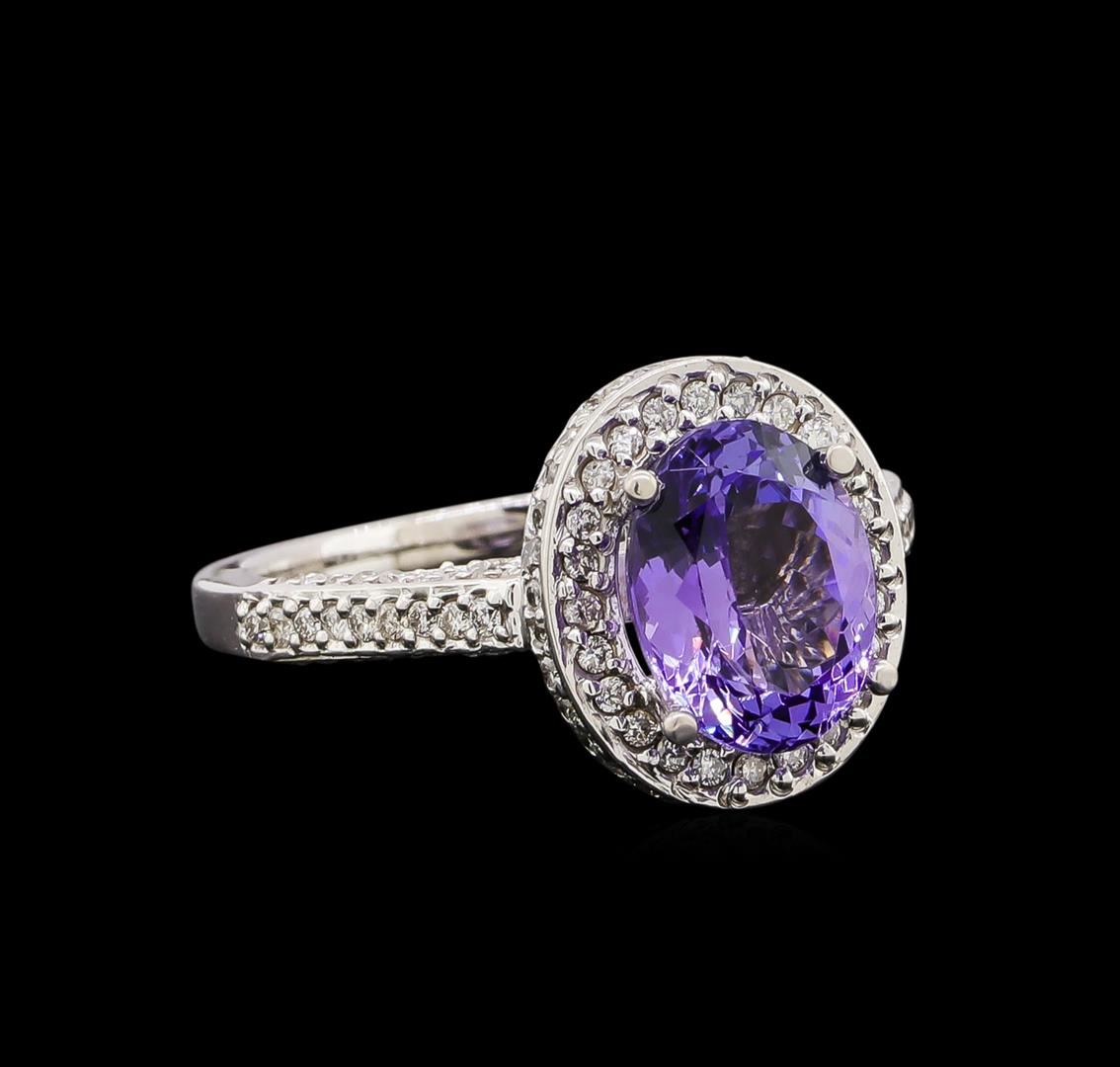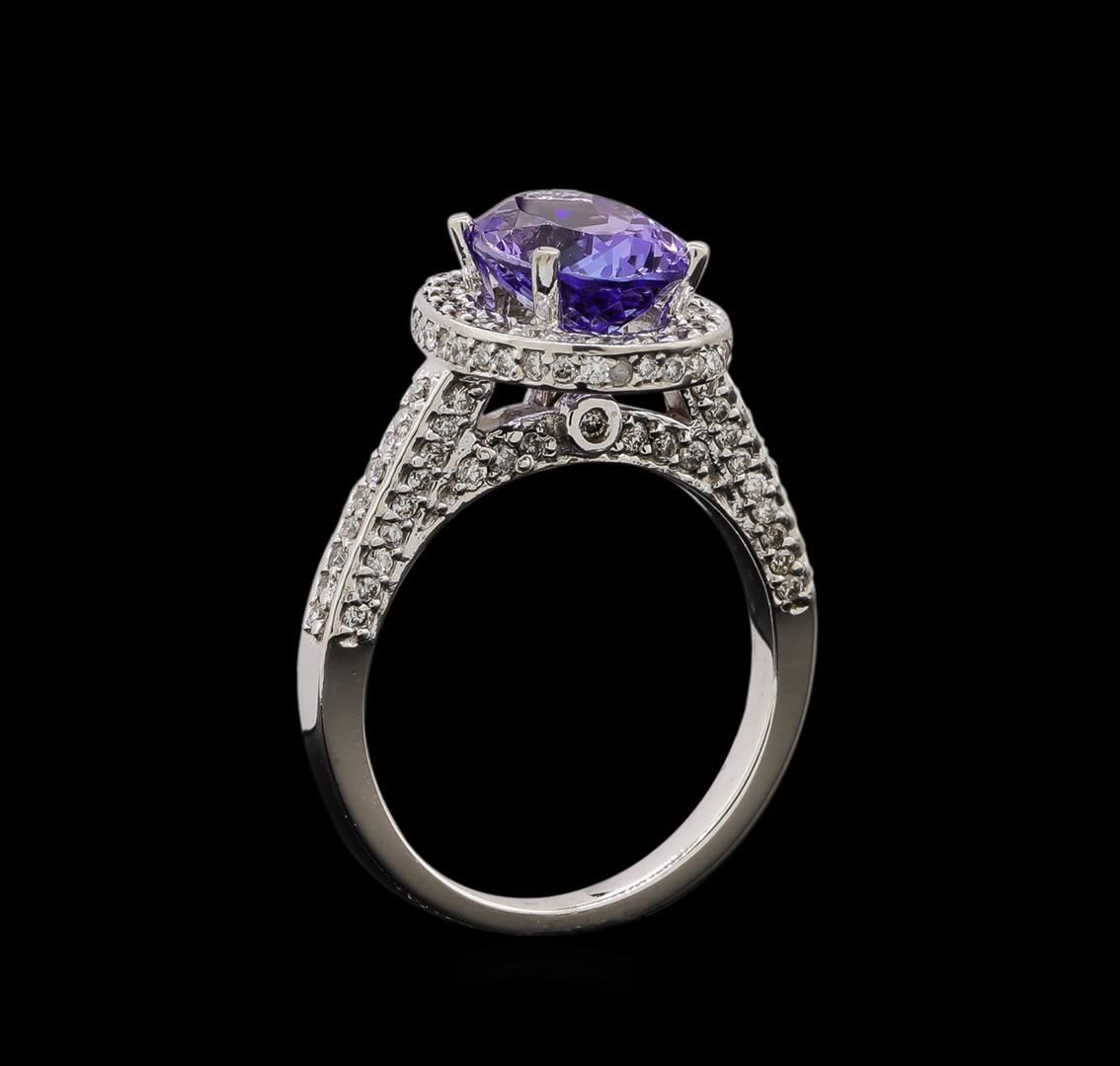 One electronically tested 14KT white gold ladies cast tanzanite and diamond ring with a bright polish finish. Identified with markings of "14K". Condition is new. Containing: One prong set oval modified brilliant cut natural tanzanite, measuring 9.70 x 7.60 x 4.56mm, approximate weight of 2.36ct., clarity is eye clean, type I, medium light, very slightly grayish, violet color, (GIA V 4/3), cut is good. One Hundred Seventy-Two prong set round brilliant cut diamonds, measuring 1.20 - 1.20 x 0.72mm (depth est.) approximate total weight of 172 Stones = 1.08ct. Clarity: SI-2 to I-1. Color: H - I, Cut is Good. Colored gemstones are presumed to have been subjected to commonly used enhancement processes. All diamonds and colored gemstones are graded in the mounting, unless otherwise stated. Total Weight of Colored Stones 2.36ct. Total Weight of Diamonds 1.08ct. Total Weight of Ring 5.70 grams. GGL Appraised at $4,030.00.