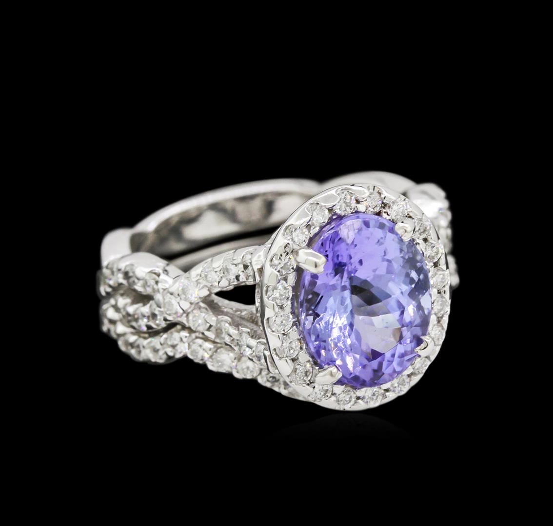 One electronically tested 14KT white gold ladies cast tanzanite and diamond ring and guard with a bright polish finish. Identified with markings of "14K". Condition is new. Containing: One prong set oval modified brilliant cut natural tanzanite, measuring 10.01 x 7.89 x 4.27mm, approximate weight of 2.37ct., clarity is eye clean, type I, medium light, very slightly grayish, violet color, (GIA V 4/3), cut is good. Forty-Six prong set round brilliant cut diamonds, measuring 1.50 - 1.50 x 0.90mm (depth est.) approximate total weight of 46 Stones = 0.57ct. Clarity: SI-2 to I-1. Color: I - J, Cut is Good. Colored gemstones are presumed to have been subjected to commonly used enhancement processes. All diamonds and colored gemstones are graded in the mounting, unless otherwise stated. Total Weight of Colored Stones 2.37ct. Total Weight of Diamonds 0.57ct. Total Weight of Ring and Guard 6.90 grams. GGL Appraised at $4,585.00.