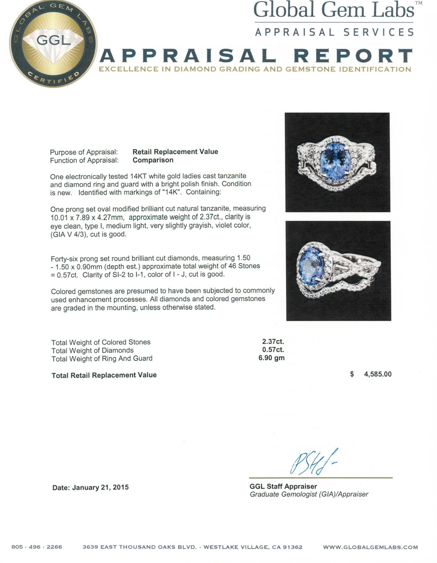 One electronically tested 14KT white gold ladies cast tanzanite and diamond ring and guard with a bright polish finish. Identified with markings of "14K". Condition is new. Containing: One prong set oval modified brilliant cut natural tanzanite, measuring 10.01 x 7.89 x 4.27mm, approximate weight of 2.37ct., clarity is eye clean, type I, medium light, very slightly grayish, violet color, (GIA V 4/3), cut is good. Forty-Six prong set round brilliant cut diamonds, measuring 1.50 - 1.50 x 0.90mm (depth est.) approximate total weight of 46 Stones = 0.57ct. Clarity: SI-2 to I-1. Color: I - J, Cut is Good. Colored gemstones are presumed to have been subjected to commonly used enhancement processes. All diamonds and colored gemstones are graded in the mounting, unless otherwise stated. Total Weight of Colored Stones 2.37ct. Total Weight of Diamonds 0.57ct. Total Weight of Ring and Guard 6.90 grams. GGL Appraised.