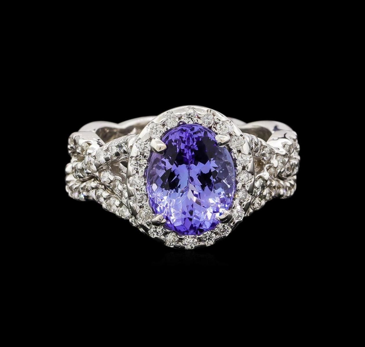 One electronically tested 14KT white gold ladies cast tanzanite and diamond ring and guard with a bright polish finish. Identified with markings of "14K". Condition is new. Containing: One prong set oval modified brilliant cut natural tanzanite, measuring 10.01 x 7.89 x 4.27mm, approximate weight of 2.37ct., clarity is eye clean, type I, medium light, very slightly grayish, violet color, (GIA V 4/3), cut is good. Forty-Six prong set round brilliant cut diamonds, measuring 1.50 - 1.50 x 0.90mm (depth est.) approximate total weight of 46 Stones = 0.57ct. Clarity: SI-2 to I-1. Color: I - J, Cut is Good. Colored gemstones are presumed to have been subjected to commonly used enhancement processes. All diamonds and colored gemstones are graded in the mounting, unless otherwise stated. Total Weight of Colored Stones 2.37ct. Total Weight of Diamonds 0.57ct. Total Weight of Ring and Guard 6.90 grams. GGL Appraised.