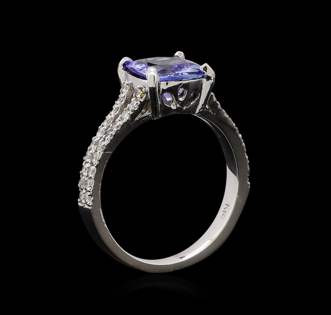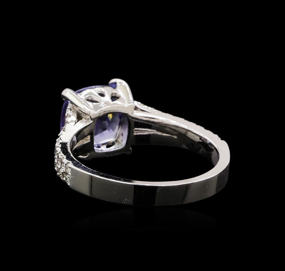 One electronically tested 14KT white gold ladies cast tanzanite and diamond ring with a bright polish finish. Identified with markings of "14K". Condition is new. Containing: One prong set square cushion modified brilliant cut natural tanzanite, measuring 8.00 x 8.00 x 4.70mm, approximate weight of 2.37ct., clarity is eye clean, type I, medium light, very slightly grayish, violet color, (GIA V 4/3), cut is good. Forty prong set round brilliant cut diamonds, measuring 1.50 - 1.50 x 0.90mm (depth est.) approximate total weight of 40 Stones = 0.49ct. Clarity: SI-1 to I-1. Color: I - J, Cut is Good. Colored gemstones are presumed to have been subjected to commonly used enhancement processes. All diamonds and colored gemstones are graded in the mounting, unless otherwise stated. Total Weight of Colored Stones 2.37ct. Total Weight of Diamonds 0.49ct. Total Weight of Ring 4.30 grams. GGL Appraised at $3,120.00.
