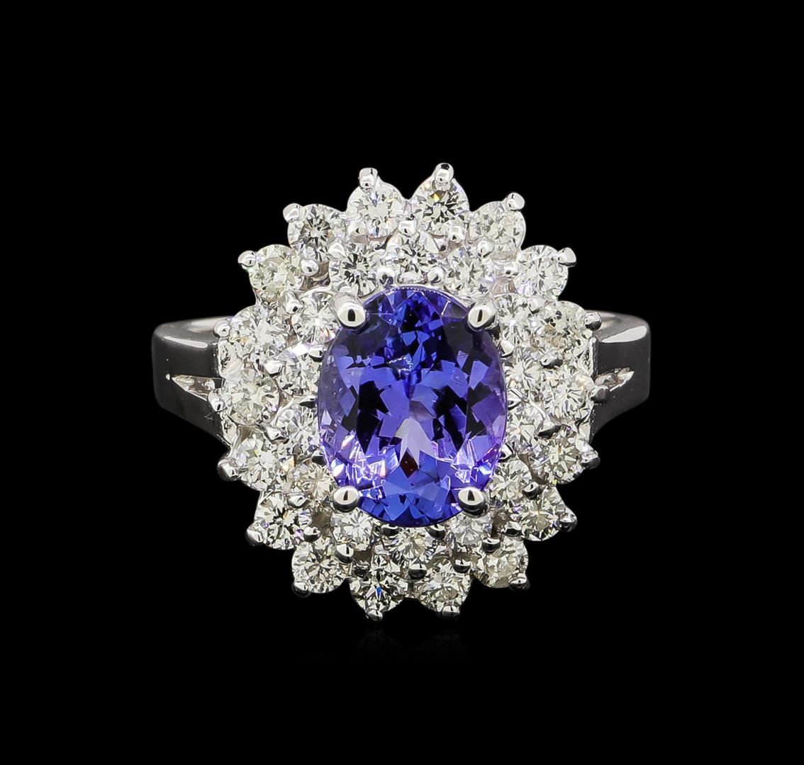 One electronically tested 14KT white gold ladies cast tanzanite and diamond ring with a bright polish finish. Identified with markings of "14K". Condition is new. Containing: One prong set oval modified brilliant cut natural tanzanite, measuring 8.90 x 7.00 x 4.55mm, approximate weight of 2.37ct., clarity is eye clean, type I, medium, moderately strong, violet color, (GIA V 5/4), cut is good. Thirty-Two prong set round brilliant cut diamonds, measuring 2.00 - 1.90 x 1.17mm (depth est.) approximate total weight of 32 Stones = 1.09ct. Clarity: SI-2 to I-1. Color: I - J, Cut is Good. Colored gemstones are presumed to have been subjected to commonly used enhancement processes. All diamonds and colored gemstones are graded in the mounting, unless otherwise stated. Total Weight of Colored Stones 2.37ct. Total Weight of Diamonds 1.09ct. Total Weight of Ring 5.70 grams. GGL Appraised at $4,210.00.