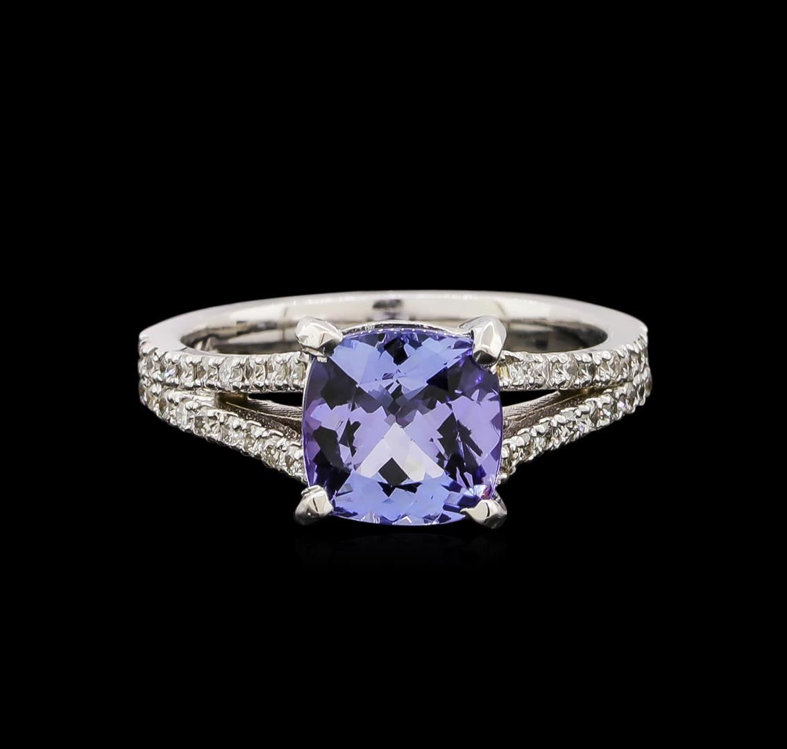 One electronically tested 14KT white gold ladies cast tanzanite and diamond ring with a bright polish finish. Identified with markings of "14K". Condition is new. Containing: One prong set square cushion modified brilliant cut natural tanzanite, measuring 8.00 x 8.00 x 4.70mm, approximate weight of 2.37ct., clarity is eye clean, type I, medium light, very slightly grayish, violet color, (GIA V 4/3), cut is good. Forty prong set round brilliant cut diamonds, measuring 1.50 - 1.50 x 0.90mm (depth est.) approximate total weight of 40 Stones = 0.49ct. Clarity: SI-1 to I-1. Color: I - J, Cut is Good. Colored gemstones are presumed to have been subjected to commonly used enhancement processes. All diamonds and colored gemstones are graded in the mounting, unless otherwise stated. Total Weight of Colored Stones 2.37ct. Total Weight of Diamonds 0.49ct. Total Weight of Ring 4.30 grams. GGL Appraised at $3,120.00.