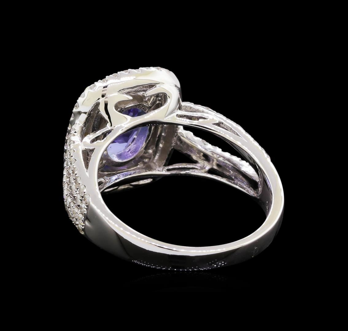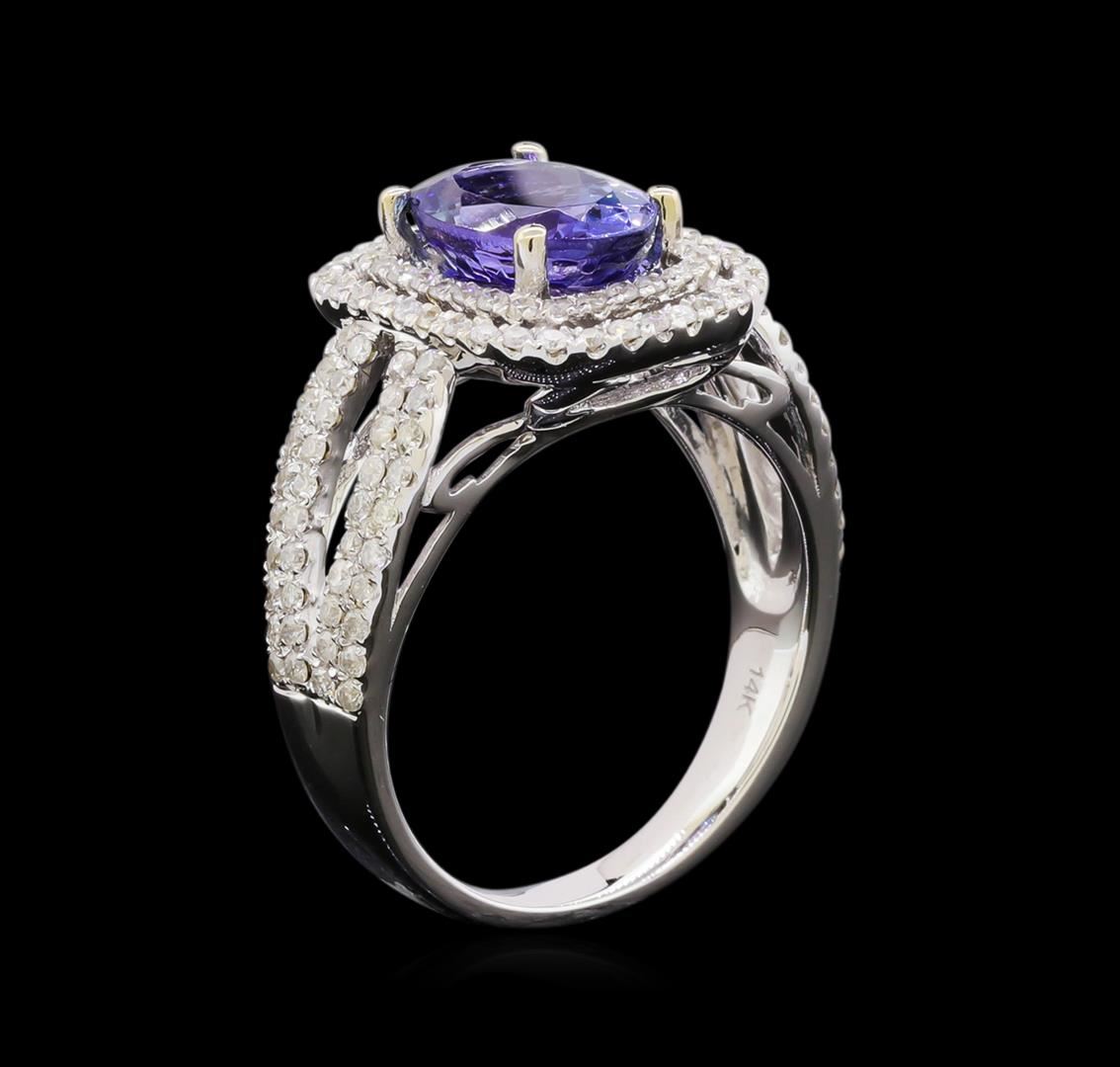 One electronically tested 14KT white gold ladies cast tanzanite and diamond ring with a bright polish finish. The featured tanzanite is set within two tiered diamond bezels supported by diamond set split shoulders, completed by a two and one-half millimeter wide band. Trademark is Orianne. Identified with markings of "14K". Condition is new, good workmanship. Containing: One prong set oval brilliant cut natural tanzanite, measuring 9.50 x 7.01 x 4.90mm, 6% bulge factor, approximate weight of 2.37ct., clarity is eye clean, type I, medium, very slightly grayish, bluish violet color, (GIA bV 5/3), cut is good. Transmitting light with no distortion, transparent. Graded in the setting. Tanzanite is a very rare gemstone that is only found in the country of Tanzania. Originally discovered in 1967. Tiffany & Company, named the stone Tanzanite. It is found in the Usumburu Mountains that border the Umba Valley of northern Tanzania. Tanzanite occurs in gray, brown, violet, blue, reddish-purple, & green. The gem is interesting because of its exceptional pleochroism. Rotated in different directions a tanzanite will exhibit multiple changes of color. Tanzanite has a low tolerance to ultrasonic cleaning, and should not be cleaned using this method. One Hundred Forty prong set round brilliant cut diamonds, measuring 1.20 - 1.10 x 0.69mm (depth est.) approximate total weight of 140 Stones = 0.87ct. Graded in the setting. Clarity: I-1 to I-3. Color: H - J. Total Weight of Colored Stones 2.37ct. Total Weight of Diamonds 0.87ct. Total Weight of Ring 5.95 grams. AIG Appraised.