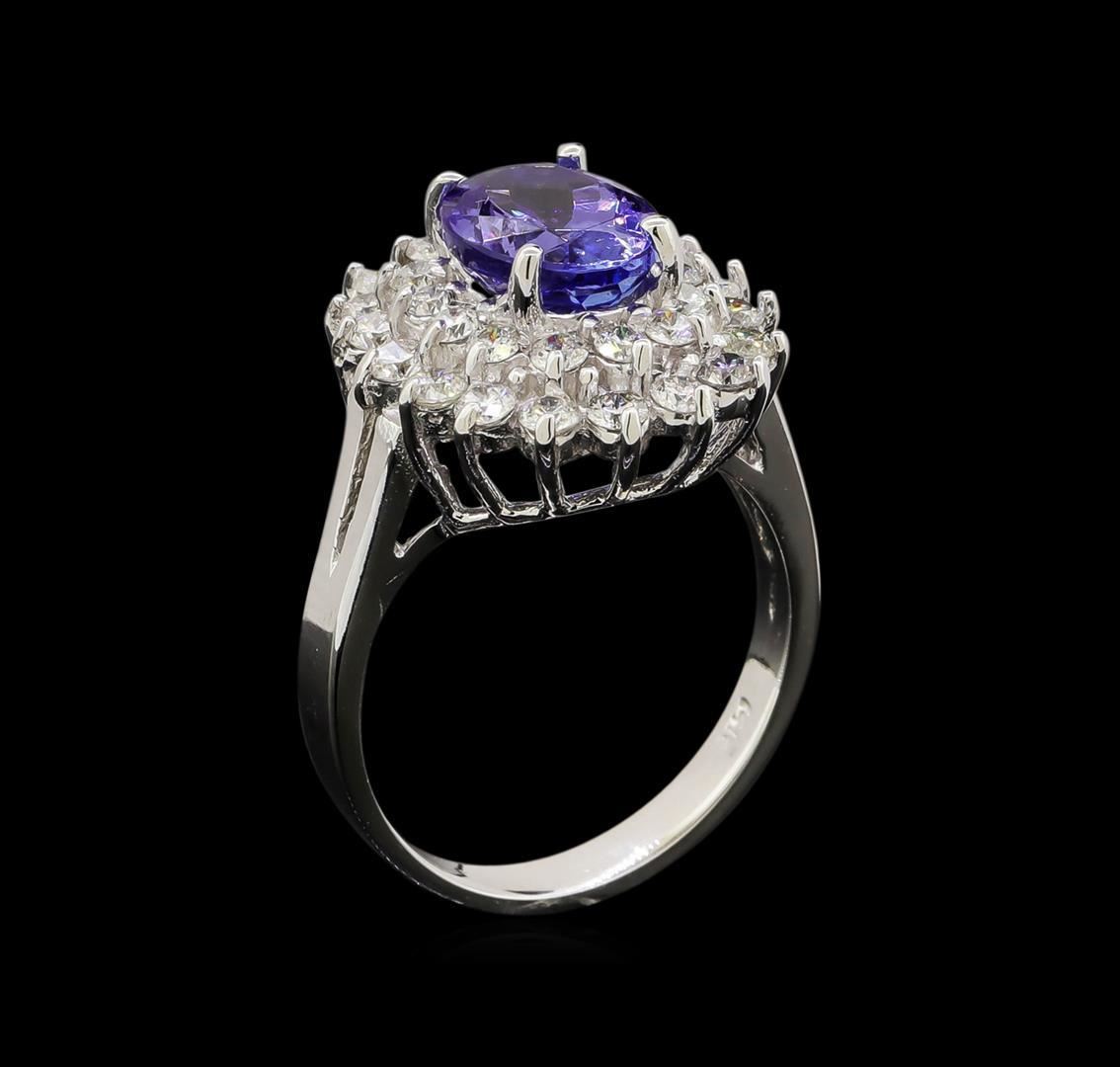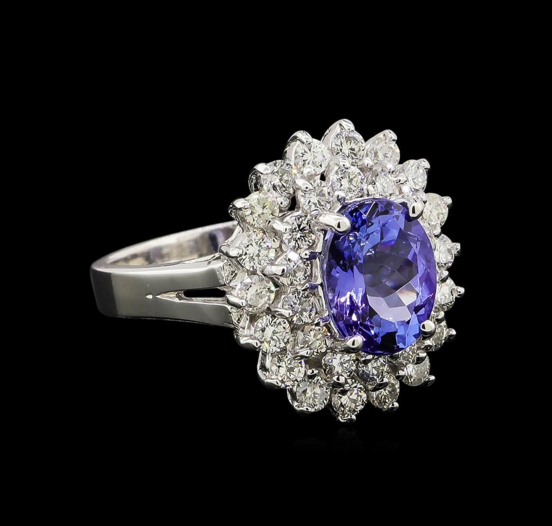 One electronically tested 14KT white gold ladies cast tanzanite and diamond ring with a bright polish finish. Identified with markings of "14K". Condition is new. Containing: One prong set oval modified brilliant cut natural tanzanite, measuring 8.90 x 7.00 x 4.55mm, approximate weight of 2.37ct., clarity is eye clean, type I, medium, moderately strong, violet color, (GIA V 5/4), cut is good. Thirty-Two prong set round brilliant cut diamonds, measuring 2.00 - 1.90 x 1.17mm (depth est.) approximate total weight of 32 Stones = 1.09ct. Clarity: SI-2 to I-1. Color: I - J, Cut is Good. Colored gemstones are presumed to have been subjected to commonly used enhancement processes. All diamonds and colored gemstones are graded in the mounting, unless otherwise stated. Total Weight of Colored Stones 2.37ct. Total Weight of Diamonds 1.09ct. Total Weight of Ring 5.70 grams. GGL Appraised.