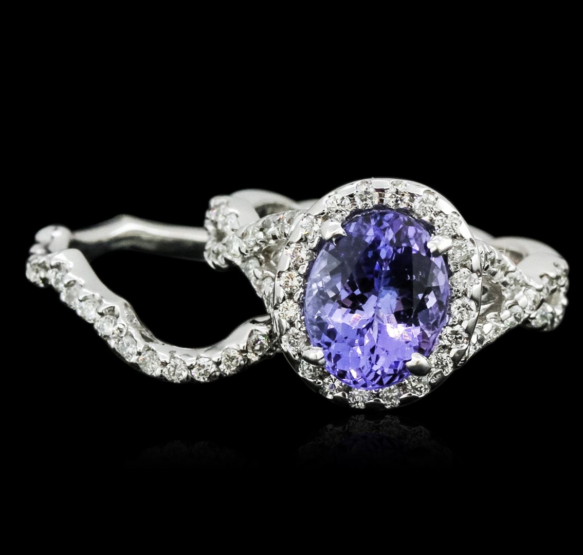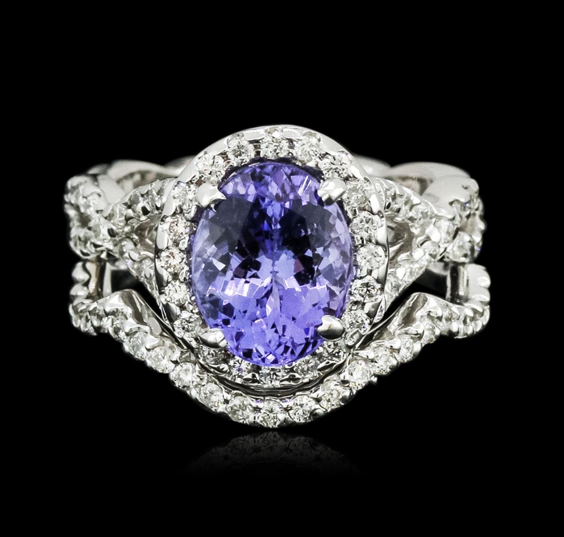 One electronically tested 14KT white gold ladies cast tanzanite and diamond ring and guard with a bright polish finish. Identified with markings of "14K". Condition is new. Containing: One prong set oval modified brilliant cut natural tanzanite, measuring 10.01 x 7.89 x 4.27mm, approximate weight of 2.37ct., clarity is eye clean, type I, medium light, very slightly grayish, violet color, (GIA V 4/3), cut is good. Forty-Six prong set round brilliant cut diamonds, measuring 1.50 - 1.50 x 0.90mm (depth est.) approximate total weight of 46 Stones = 0.57ct. Clarity: SI-2 to I-1. Color: I - J, Cut is Good. Colored gemstones are presumed to have been subjected to commonly used enhancement processes. All diamonds and colored gemstones are graded in the mounting, unless otherwise stated. Total Weight of Colored Stones 2.37ct. Total Weight of Diamonds 0.57ct. Total Weight of Ring and Guard 6.90 grams. GGL Appraised at $4,585.00.