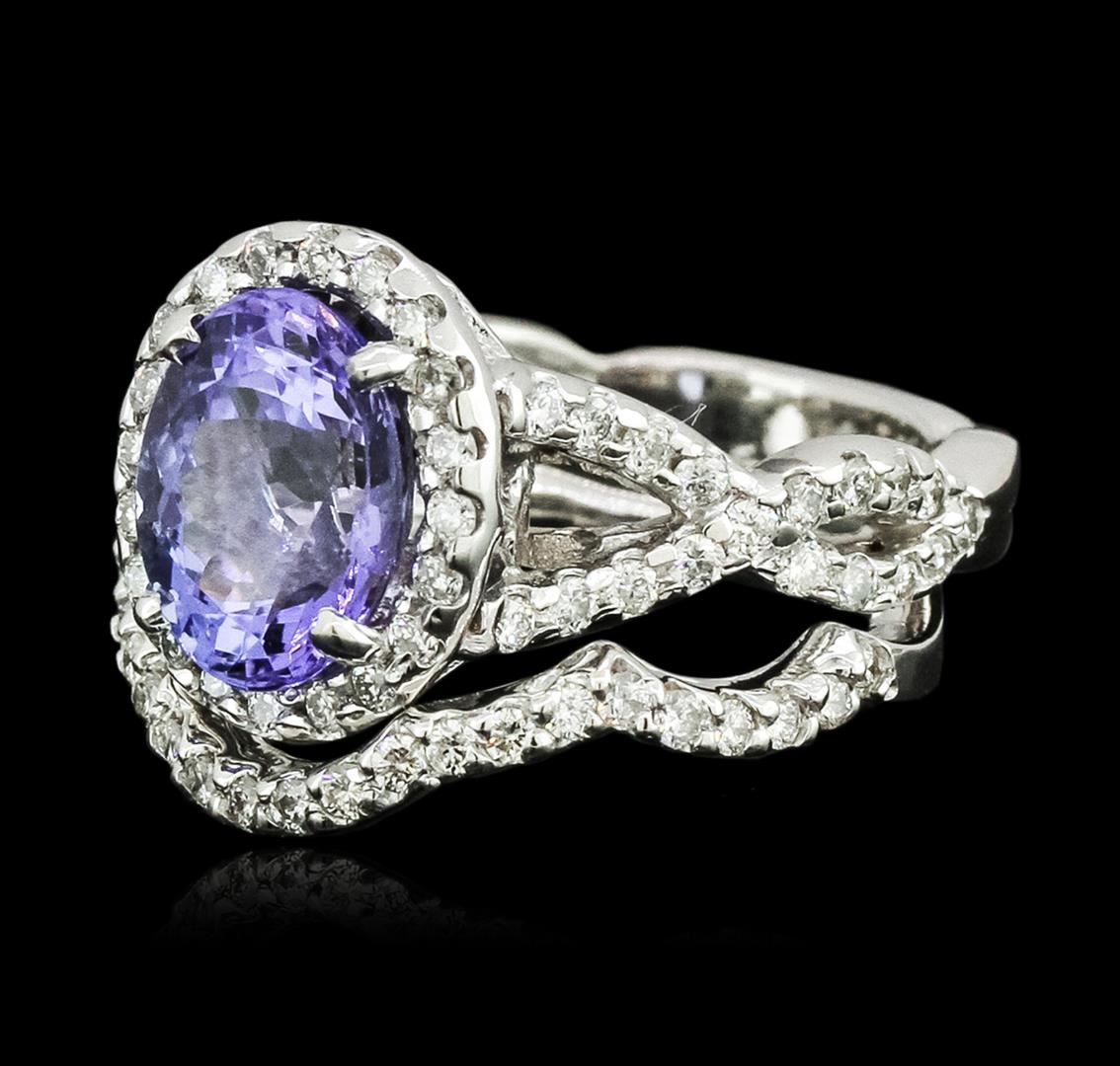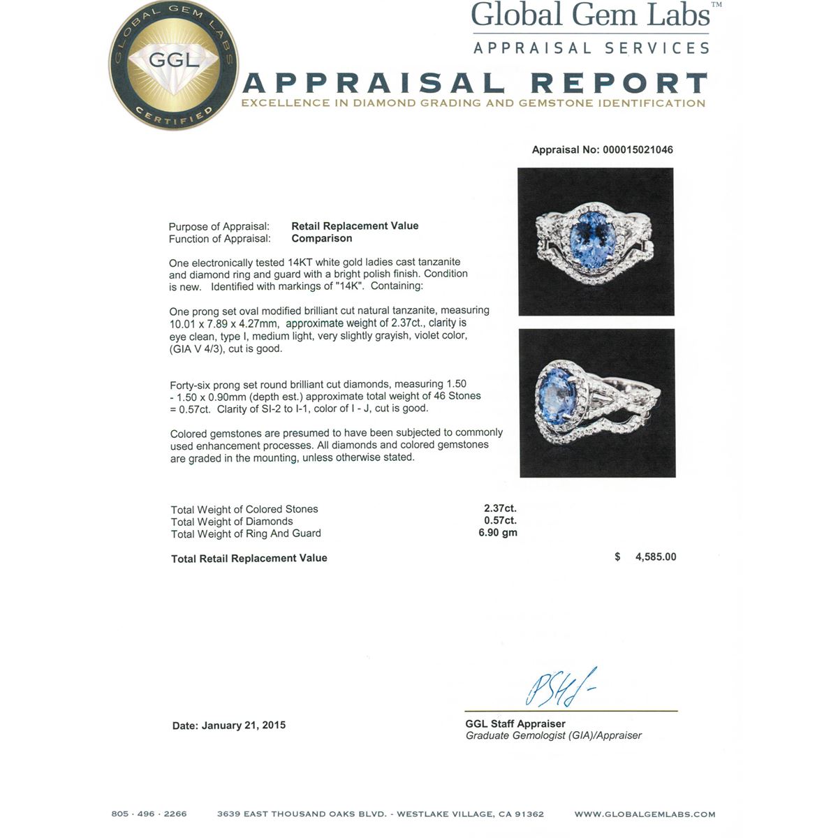 One electronically tested 14KT white gold ladies cast tanzanite and diamond ring and guard with a bright polish finish. Identified with markings of "14K". Condition is new. Containing: One prong set oval modified brilliant cut natural tanzanite, measuring 10.01 x 7.89 x 4.27mm, approximate weight of 2.37ct., clarity is eye clean, type I, medium light, very slightly grayish, violet color, (GIA V 4/3), cut is good. Forty-Six prong set round brilliant cut diamonds, measuring 1.50 - 1.50 x 0.90mm (depth est.) approximate total weight of 46 Stones = 0.57ct. Clarity: SI-2 to I-1. Color: I - J, Cut is Good. Colored gemstones are presumed to have been subjected to commonly used enhancement processes. All diamonds and colored gemstones are graded in the mounting, unless otherwise stated. Total Weight of Colored Stones 2.37ct. Total Weight of Diamonds 0.57ct. Total Weight of Ring and Guard 6.90 grams. GGL Appraised at $4,585.00.