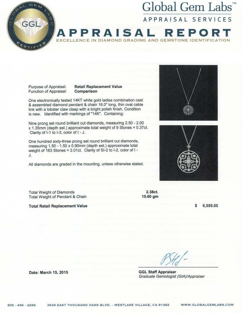 One electronically tested 14KT white gold ladies combination cast & assembled diamond pendant & chain 16.0" long, thin oval cable link with a lobster claw clasp with a bright polish finish. Identified with markings of "14K". Condition is new. Containing: Nine prong set round brilliant cut diamonds, measuring 2.50 - 2.00 x 1.35mm (depth est.) approximate total weight of 9 Stones = 0.37ct. Clarity of I-1 to I-3, Color of I - J. One Hundred Sixty-Three prong set round brilliant cut diamonds, measuring 1.50 - 1.50 x 0.90mm (depth est.) approximate total weight of 163 Stones = 2.01ct. Clarity of SI-2 to I-2, Color of I - J. All diamonds are graded in the mounting, unless otherwise stated. Total Weight of Diamonds 2.38ct. Total Weight of Pendant & Chain 15.60 grams. GGL Appraised at $6,555.00.