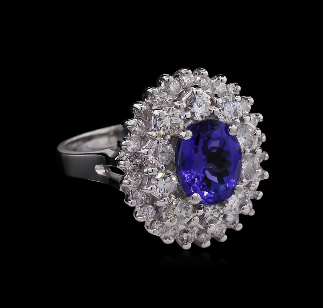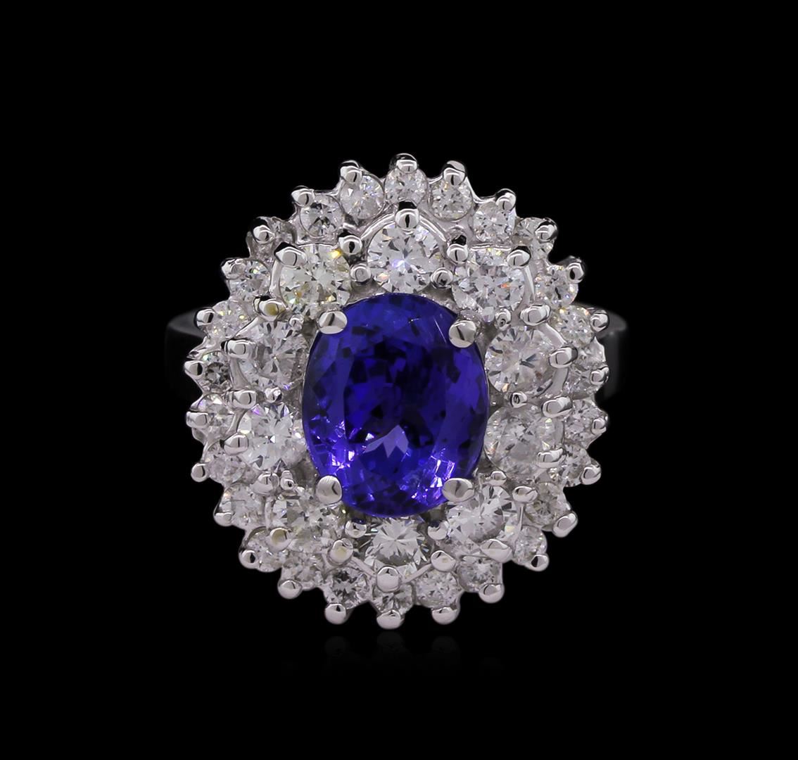 One electronically tested 14KT white gold Ladies cast ring with a bright polish finish. Condition is new. Identified with markings of "14K". Containing: One prong set oval modified brilliant cut natural tanzanite, measuring 9.10 x 7.50 x 5.15mm, approximate weight of 2.38ct., clarity is eye clean, type I, medium, moderately strong, violet color, (GIA V 5/4), cut is good. Colored gemstones are presumed to have been subjected to commonly used color/clarity enhancement processes. Twenty-Six prong set round brilliant cut diamonds, measuring 1.90 - 1.90 x 1.14mm (depth est.) approximate. Total Weight of 26 Stones = 0.65ct. Clarity: I-1 to I-2. Color: H - I, Cut is Good. All grading of diamonds and colored gemstones in this piece of jewelry are graded in the mounting, unless otherwise stated. Ten prong set round brilliant cut diamonds, measuring 2.90 - 2.90 x 1.74mm (depth est.) approximate. Total Weight of 10 Stones = 0.89ct. Clarity: SI-2 to I-1. Color: I - J, Cut is Good. All grading of diamonds and colored gemstones in this piece of jewelry are graded in the mounting, unless otherwise stated. Total Weight of Colored Stones 2.38ct. Total Weight of Diamonds 1.55ct. Total Weight of Ring 8.40 grams. GGL Appraised at $9,465.00.
