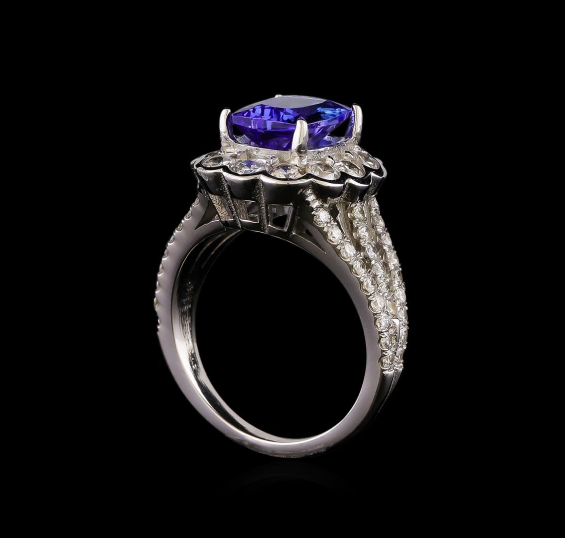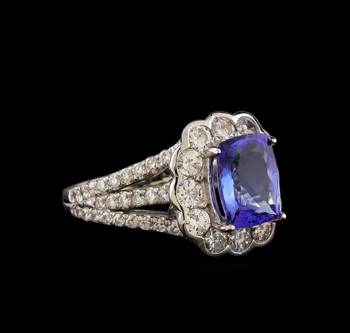 One electronically tested 14KT white gold ladies combination cast & assembled tanzanite and diamond ring with a bright polish finish. Identified with markings of "14K". Condition is new. Containing: One prong set rectangular cushion modified brilliant cut natural tanzanite, measuring 9.22 x 7.10 x 4.62mm, approximate weight of 2.38ct., clarity is eye clean, type I, medium light, very slightly grayish, violet color, (GIA V 4/3), cut is good. Forty-Eight prong set round brilliant cut diamonds, measuring 1.50 - 1.50 x 0.90mm (depth est.) approximate total weight of 48 Stones = 0.59ct. Clarity: SI-2 to I-1. Color: I - J, Cut is Good. Twelve prong set round brilliant cut diamonds, measuring 2.80 - 2.80 x 1.68mm (depth est.) approximate total weight of 12 Stones = 0.96ct. Clarity: SI-2 to I-1. Color: I - J, Cut is Good. Colored gemstones are presumed to have been subjected to commonly used enhancement processes. All diamonds and colored gemstones are graded in the mounting, unless otherwise stated. Total Weight of Colored Stones 2.38ct. Total Weight of Diamonds 1.55ct. Total Weight of Ring 7.10 grams. GGL Appraised at $6,610.00.