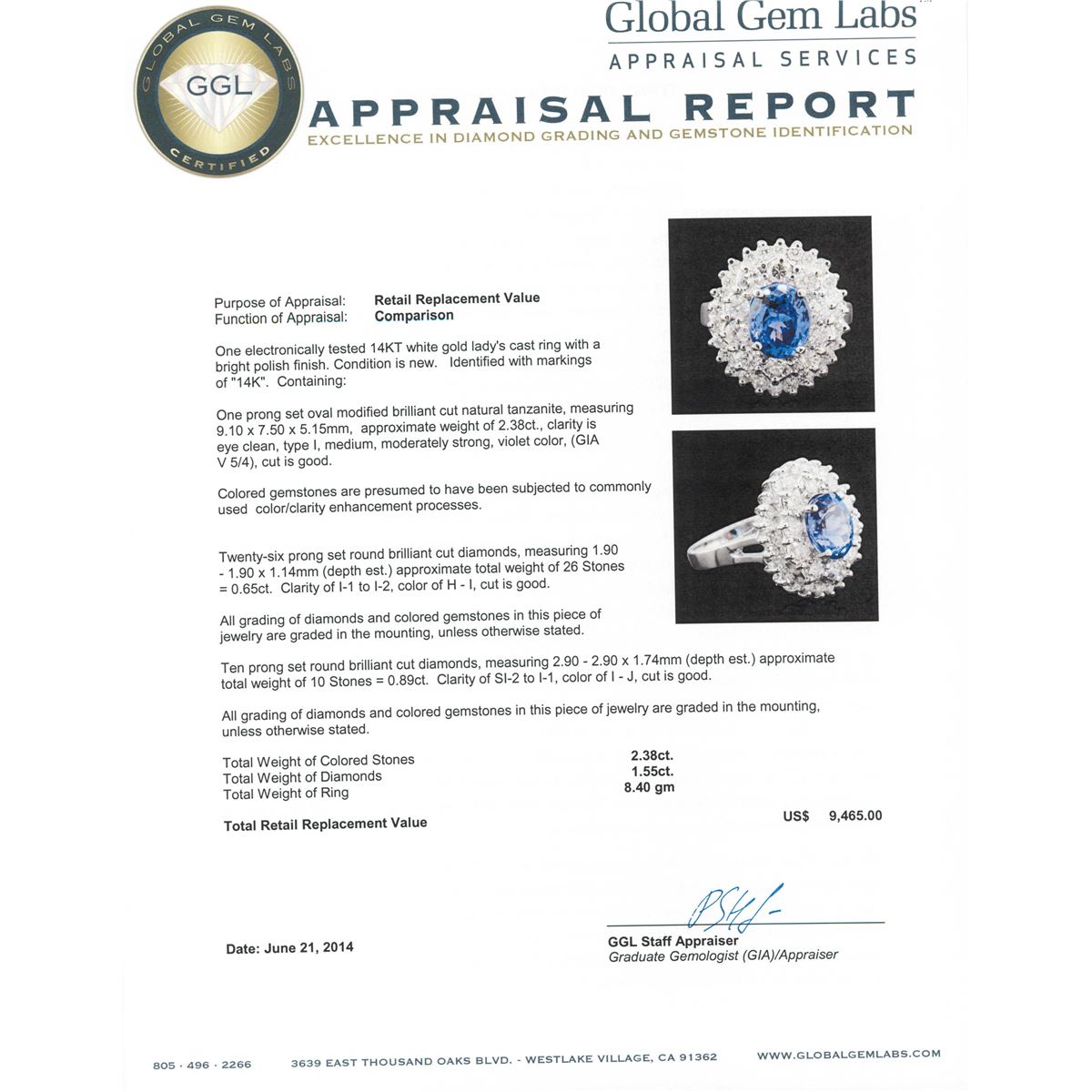 One electronically tested 14KT white gold Ladies cast ring with a bright polish finish. Condition is new. Identified with markings of "14K". Containing: One prong set oval modified brilliant cut natural tanzanite, measuring 9.10 x 7.50 x 5.15mm, approximate weight of 2.38ct., clarity is eye clean, type I, medium, moderately strong, violet color, (GIA V 5/4), cut is good. Colored gemstones are presumed to have been subjected to commonly used color/clarity enhancement processes. Twenty-Six prong set round brilliant cut diamonds, measuring 1.90 - 1.90 x 1.14mm (depth est.) approximate. Total Weight of 26 Stones = 0.65ct. Clarity: I-1 to I-2. Color: H - I, Cut is Good. All grading of diamonds and colored gemstones in this piece of jewelry are graded in the mounting, unless otherwise stated. Ten prong set round brilliant cut diamonds, measuring 2.90 - 2.90 x 1.74mm (depth est.) approximate. Total Weight of 10 Stones = 0.89ct. Clarity: SI-2 to I-1. Color: I - J, Cut is Good. All grading of diamonds and colored gemstones in this piece of jewelry are graded in the mounting, unless otherwise stated. Total Weight of Colored Stones 2.38ct. Total Weight of Diamonds 1.55ct. Total Weight of Ring 8.40 grams. GGL Appraised at $9,465.00.