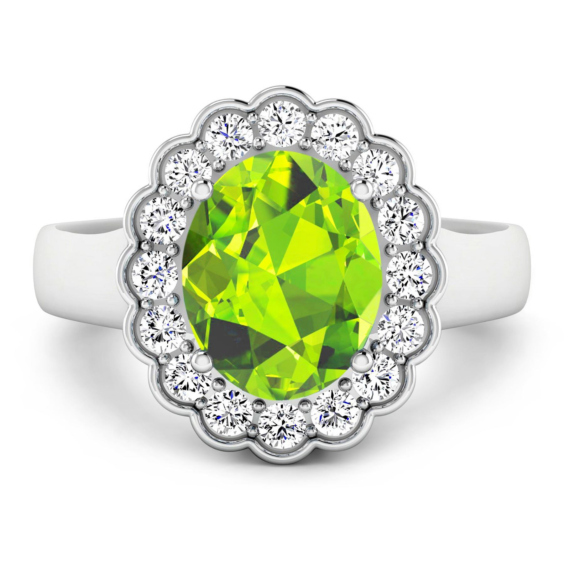 Peridot Oval 10x8mm - 1Pc + White Diamond F/C Round 2.00mm - 16Pcs ( SI-2/HI ) Total weight of gemstone is 2.3cts. Total Diamond weight is 0.48cts. Total weight of this ring is 3.99 grams. Ring size 7.