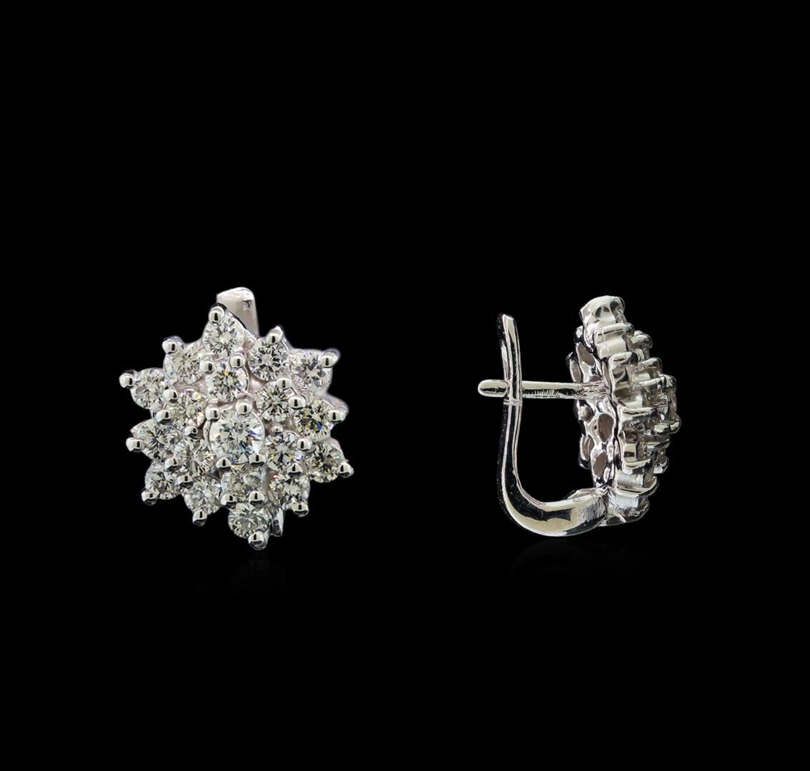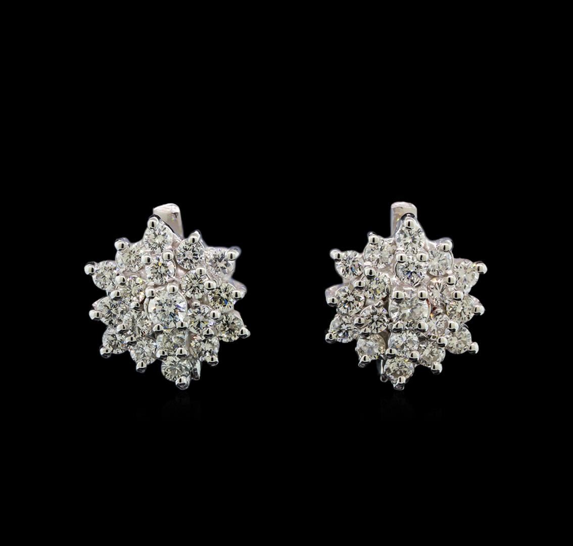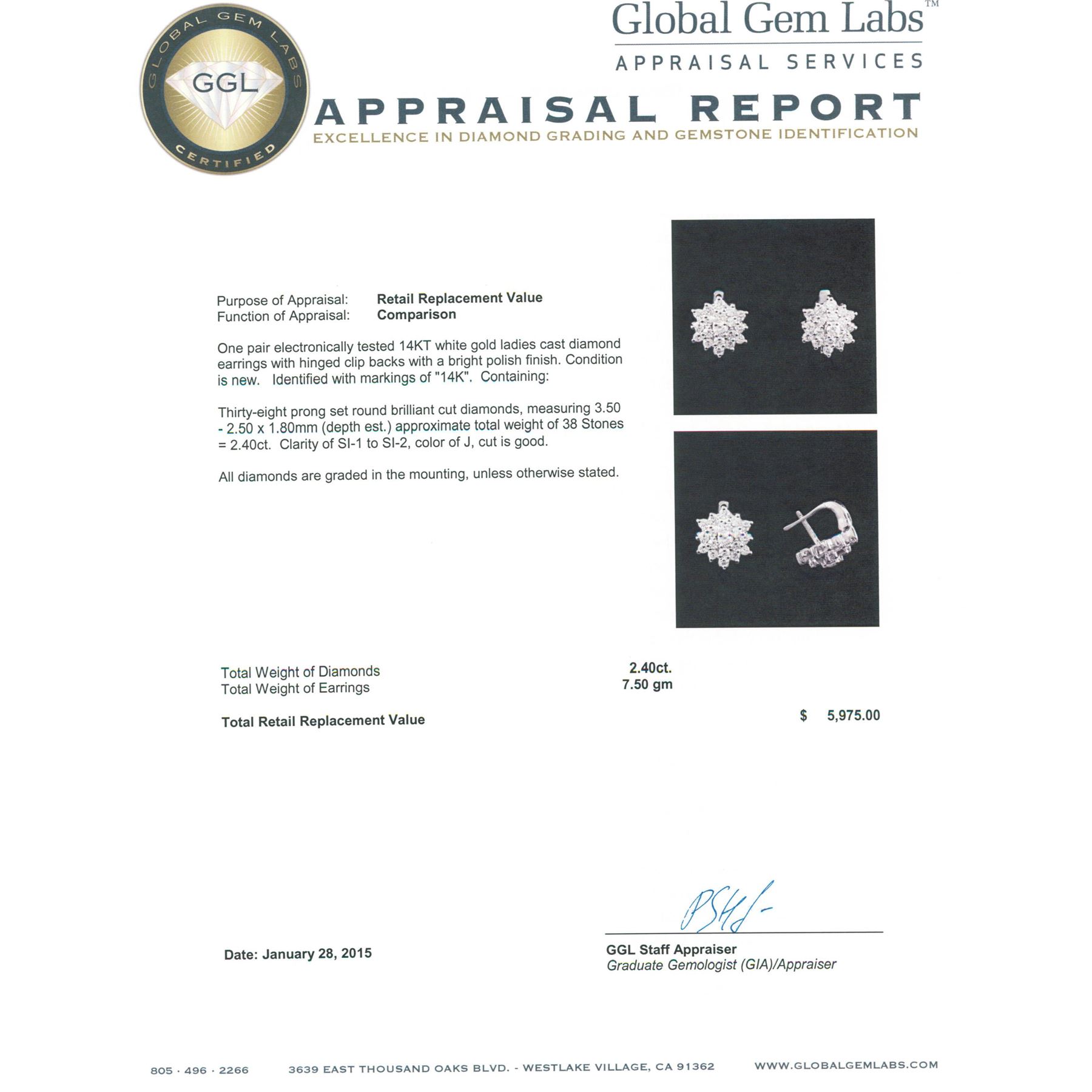 One pair electronically tested 14KT white gold ladies cast diamond earrings with hinged clip backs with a bright polish finish. Identified with markings of "14K". Condition is new. Containing: Thirty-Eight prong set round brilliant cut diamonds, measuring 3.50 - 2.50 x 1.80mm (depth est.) approximate total weight of 38 Stones = 2.40ct. Clarity: SI-1 to SI-2. Color: J, Cut is Good. All diamonds are graded in the mounting, unless otherwise stated. Total Weight of Diamonds 2.40ct. Total Weight of Earrings 7.50 grams. GGL Appraised at $5,975.00.