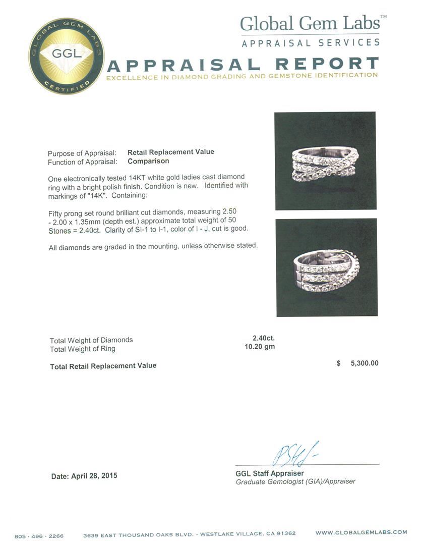 One electronically tested 14KT white gold ladies cast diamond ring with a bright polish finish. Identified with markings of "14K". Condition is new. Containing: Fifty prong set round brilliant cut diamonds, measuring 2.50 - 2.00 x 1.35mm (depth est.) approximate total weight of 50 Stones = 2.40ct. Clarity: SI-1 to I-1. Color: I - J, Cut is Good. All diamonds are graded in the mounting, unless otherwise stated. Total Weight of Diamonds 2.40ct. Total Weight of Ring 10.20 grams. GGL Appraised at $5,300.00.