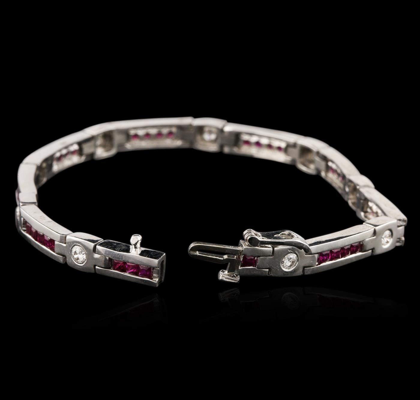 One bracelet featuring: 14KT white gold weighing 17.90 grams containing princess cut rubies with a total weight of 2.40ct and round diamonds with a total weight of 0.54ct.