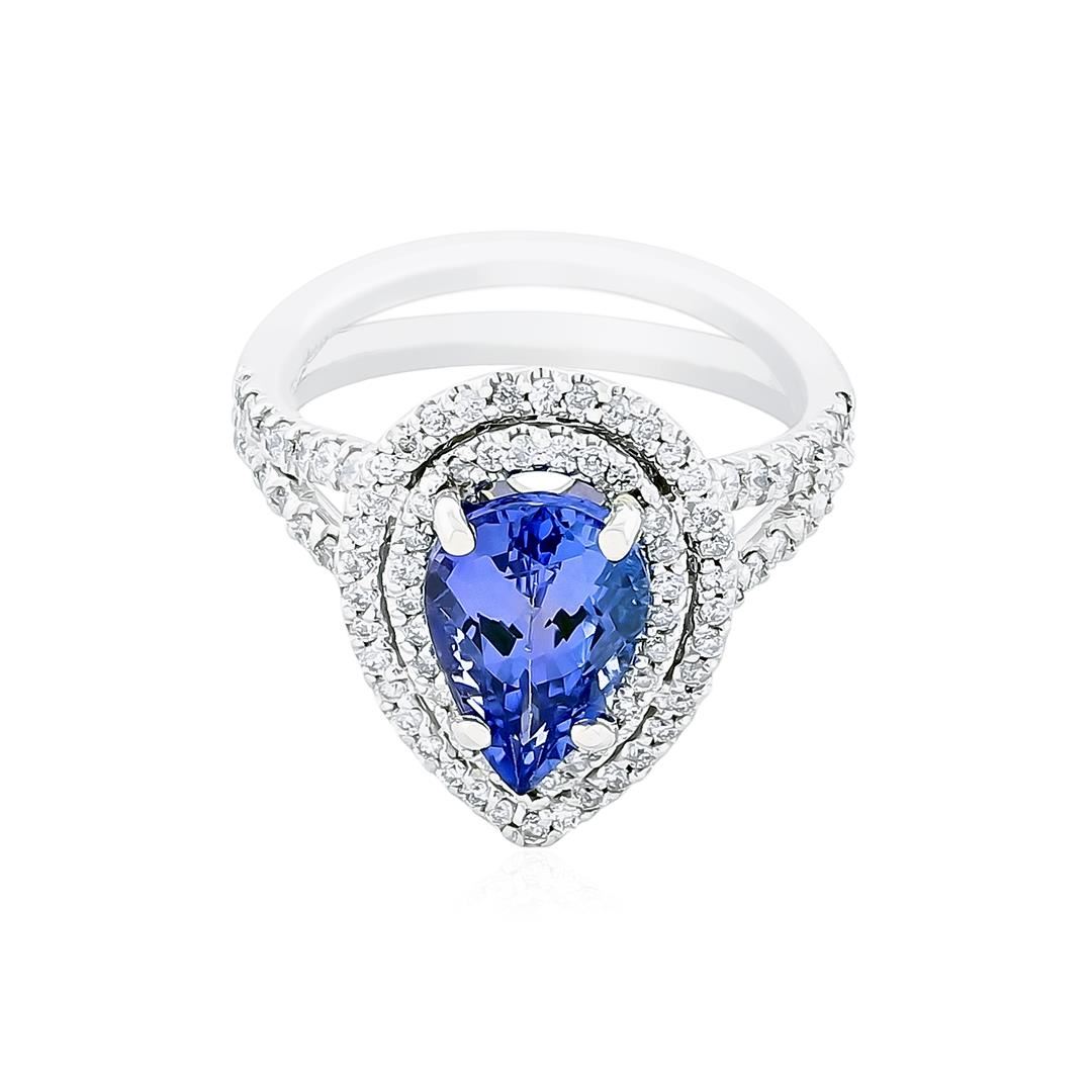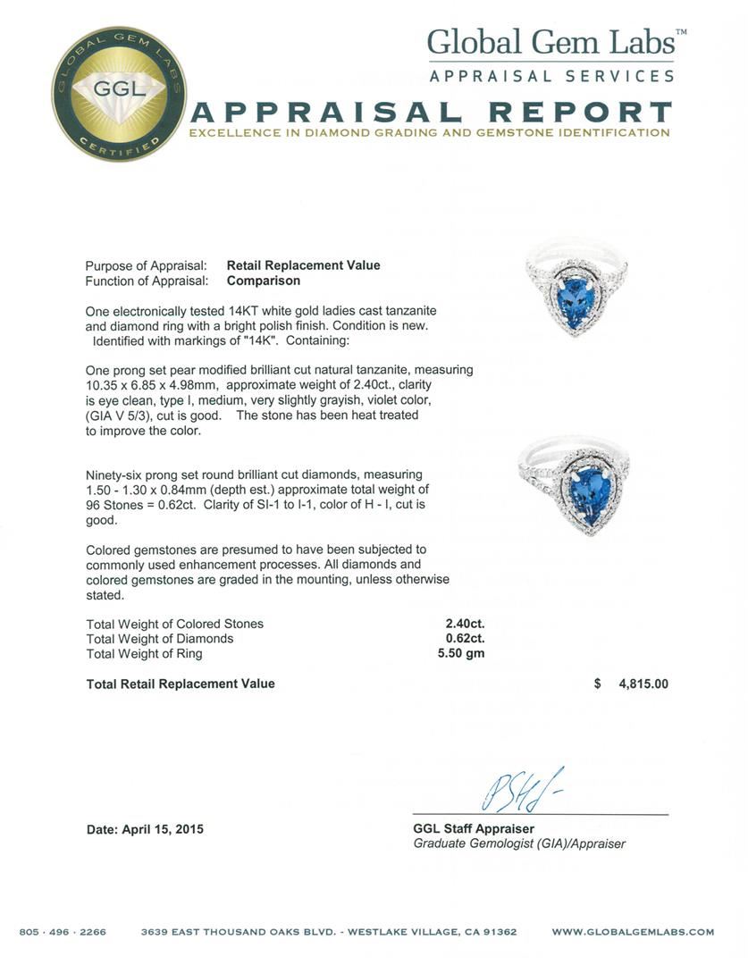 One electronically tested 14KT white gold ladies cast tanzanite and diamond ring with a bright polish finish. Identified with markings of "14K". Condition is new. Containing: One prong set pear modified brilliant cut natural tanzanite, measuring 10.35 x 6.85 x 4.98mm, approximate weight of 2.40ct., clarity is eye clean, type I, medium, very slightly grayish, violet color, (GIA V 5/3), cut is good. The stone has been heat treated to improve the color. Ninety-Six prong set round brilliant cut diamonds, measuring 1.50 - 1.30 x 0.84mm (depth est.) approximate total weight of 96 Stones = 0.62ct. Clarity: SI-1 to I-1. Color: H - I, Cut is Good. Colored gemstones are presumed to have been subjected to commonly used enhancement processes. All diamonds and colored gemstones are graded in the mounting, unless otherwise stated. Total Weight of Colored Stones 2.40ct. Total Weight of Diamonds 0.62ct. Total Weight of Ring 5.50 grams. GGL Appraised at $4,815.00.
