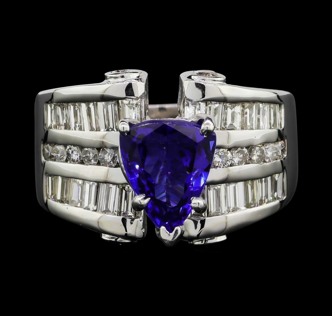 One electronically tested 14KT white gold lady's combination cast & assembled fashion ring with a three row wide band with a bright polish finish. The featured lady's ring has a shank measuring 5.70 millimeters wide. Identified with markings of "14K". Condition is new, good workmanship. Containing: One prong set triangle modified brilliant cut natural tanzanite, measuring 9.50 x 7.70 x 4.90mm, (depth est.) 10%. bulge factor, approximate weight of 2.40ct., clarity is eye clean, medium dark, strong, violetish blue color, (GIA vB 6/5), cut is good. Transmitting light with no distortion, transparent. Colored gemstones are presumed to have been subjected to commonly used enhancement processes. Graded in the setting. Four bezel set round brilliant cut diamonds, measuring 2.40 - 2.35 x 1.48mm (depth est.) approximate total weight of 4 Stones = 0.20ct. Graded in the setting. Clarity: SI-1 to SI-2. Color: H - ICut Good Twelve channel set round brilliant cut diamonds, measuring 1.90 - 1.80 x 1.15mm (depth est.) approximate total weight of 12 Stones = 0.30ct. Graded in the setting. Clarity: SI-1 to I-1. Color: H - ICut Good Twenty-Four channel set baguette cut diamonds, measuring from 2.40 x 1.55 x 1.32mm (depth est.) to 2.80 x 1.70 x 1.45mm (depth est.) approximate total weight of 24 Stones = 1.30ct. Graded in the setting. Clarity: VS-1 to VS-2. Color: H - ICut Very Good. Total Weight of Colored Stones 2.40ct. Total Weight of Diamonds 1.80ct. Total Weight of Ring 13.30gm. GAS Appraised.