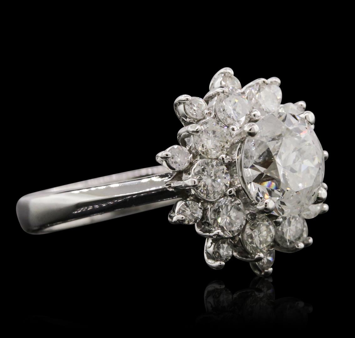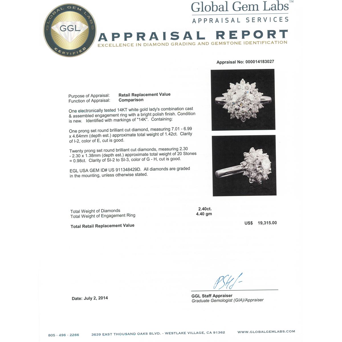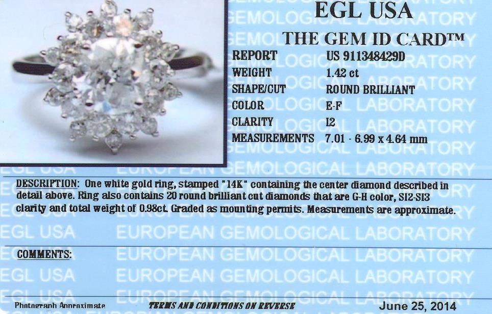 One electronically tested 14KT white gold Ladies combination cast & assembled engagement ring with a bright polish finish. Condition is new. Identified with markings of "14K". Containing: One prong set round brilliant cut diamond, measuring 7.01 - 6.99 x 4.64mm (depth est.) approximate. Total Weight of 1.42ct. Clarity: I-2. Color: E, Cut is Good. Twenty prong set round brilliant cut diamonds, measuring 2.30 - 2.30 x 1.38mm (depth est.) approximate. Total Weight of 20 Stones = 0.98ct. Clarity: SI-2 to SI-3. Color: G - H, Cut is Good. EGL USA GEM ID# US 911348429D. All diamonds are graded in the mounting, unless otherwise stated. Total Weight of Diamonds 2.40ct. Total Weight of Engagement Ring 4.40 grams. GGL Appraised at $19,315.00.