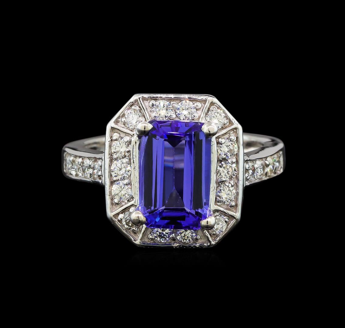 One electronically tested 14KT white gold ladies cast tanzanite and diamond ring with a bright polish finish. Condition is new. Containing: One prong set emerald standard step cut natural tanzanite, measuring 9.70 x 6.50 x 4.23mm, approximate weight of 2.41ct., clarity is eye clean, type I, medium light, very slightly grayish, violet color, (GIA V 4/3), cut is good. Twenty-Two prong set round brilliant cut diamonds, measuring 2.00 - 2.00 x 1.20mm (depth est.) approximate total weight of 22 Stones = 0.64ct. Clarity: SI-1 to SI-2. Color: H - I, Cut is Good. Colored gemstones are presumed to have been subjected to commonly used enhancement processes. All diamonds and colored gemstones are graded in the mounting, unless otherwise stated. Total Weight of Colored Stones 2.41ct. Total Weight of Diamonds 0.64ct. Total Weight of Ring 6.50 grams. GGL Appraised at $4,775.00.