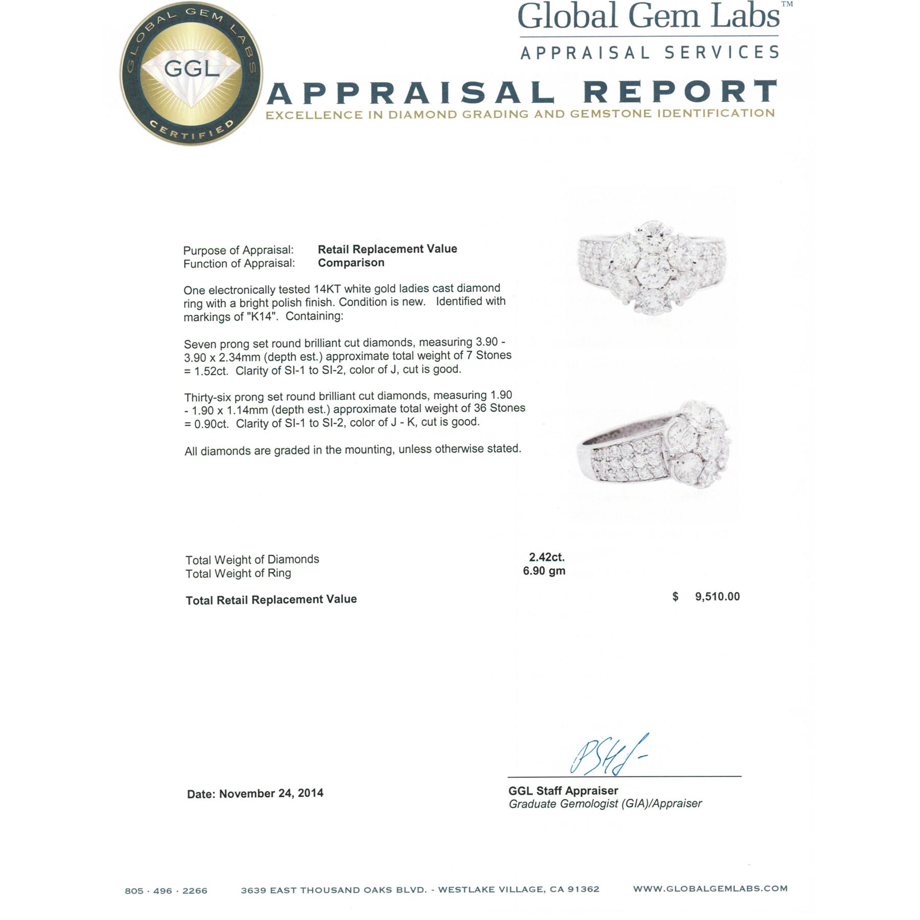 One electronically tested 14KT white gold ladies cast diamond ring with a bright polish finish. Identified with markings of "K14". Condition is new. Containing: Seven prong set round brilliant cut diamonds, measuring 3.90 - 3.90 x 2.34mm (depth est.) approximate total weight of 7 Stones = 1.52ct. Clarity: SI-1 to SI-2. Color: J, Cut is Good. Thirty-Six prong set round brilliant cut diamonds, measuring 1.90 - 1.90 x 1.14mm (depth est.) approximate total weight of 36 Stones = 0.90ct. Clarity: SI-1 to SI-2. Color: J - K, Cut is Good. All diamonds are graded in the mounting, unless otherwise stated. Total Weight of Diamonds 2.42ct. Total Weight of Ring 6.90 grams. GGL Appraised at $9,510.00.