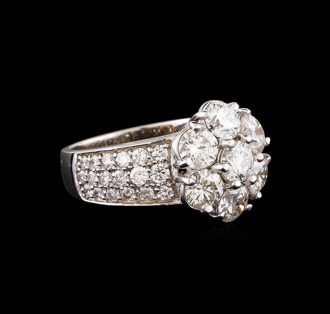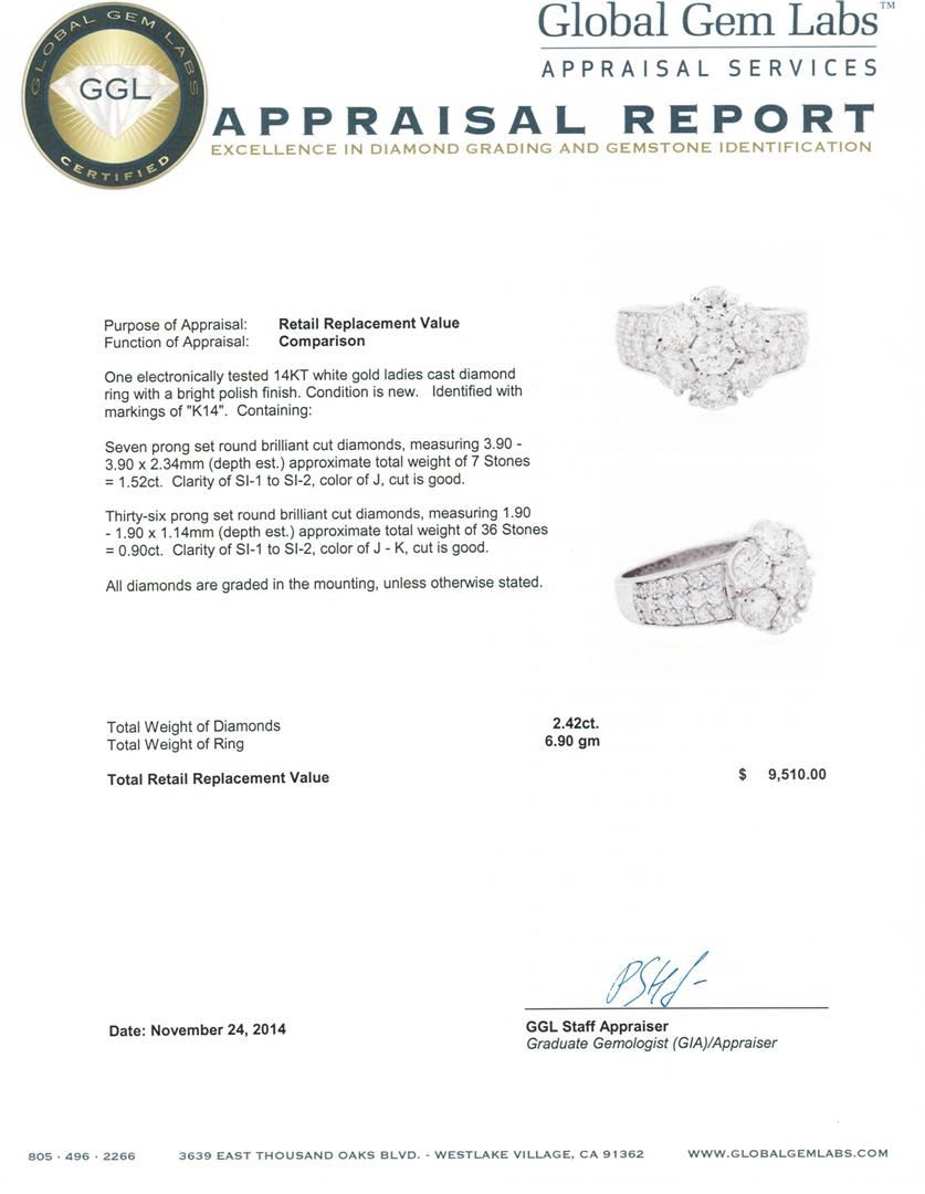 One electronically tested 14KT white gold ladies cast diamond ring with a bright polish finish. Identified with markings of "K14". Condition is new. Containing: Seven prong set round brilliant cut diamonds, measuring 3.90 - 3.90 x 2.34mm (depth est.) approximate total weight of 7 Stones = 1.52ct. Clarity: SI-1 to SI-2. Color: J, Cut is Good. Thirty-Six prong set round brilliant cut diamonds, measuring 1.90 - 1.90 x 1.14mm (depth est.) approximate total weight of 36 Stones = 0.90 ct. Clarity: SI-1 to SI-2. Color: J - K, Cut is Good. All diamonds are graded in the mounting, unless otherwise stated. Total Weight of Diamonds 2.42ct. Total Weight of Ring 6.90 grams. GGL Appraised.