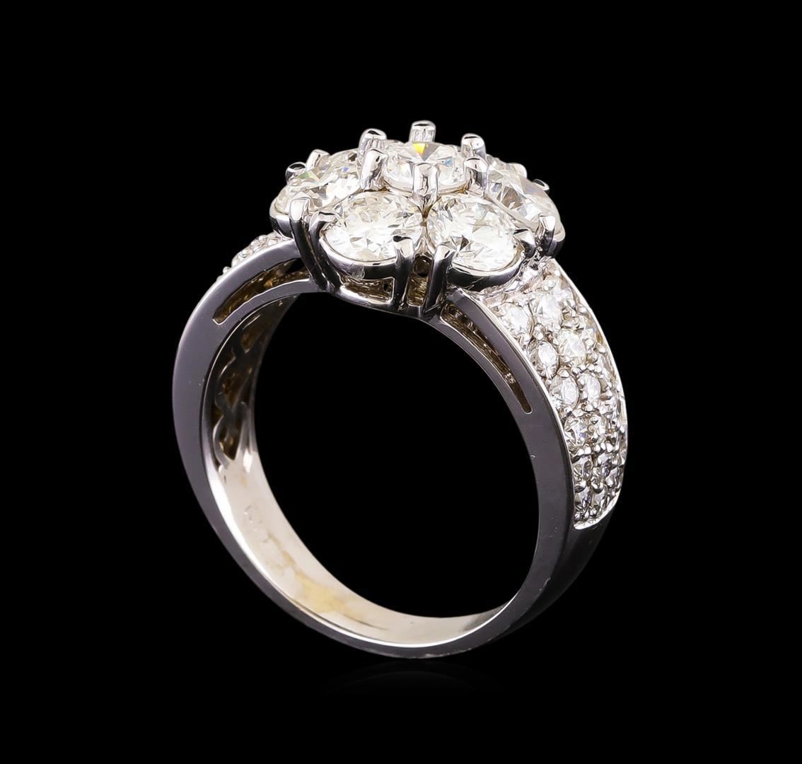 One electronically tested 14KT white gold ladies cast diamond ring with a bright polish finish. Identified with markings of "K14". Condition is new. Containing: Seven prong set round brilliant cut diamonds, measuring 3.90 - 3.90 x 2.34mm (depth est.) approximate total weight of 7 Stones = 1.52ct. Clarity: SI-1 to SI-2. Color: J, Cut is Good. Thirty-Six prong set round brilliant cut diamonds, measuring 1.90 - 1.90 x 1.14mm (depth est.) approximate total weight of 36 Stones = 0.90 ct. Clarity: SI-1 to SI-2. Color: J - K, Cut is Good. All diamonds are graded in the mounting, unless otherwise stated. Total Weight of Diamonds 2.42ct. Total Weight of Ring 6.90 grams. GGL Appraised.