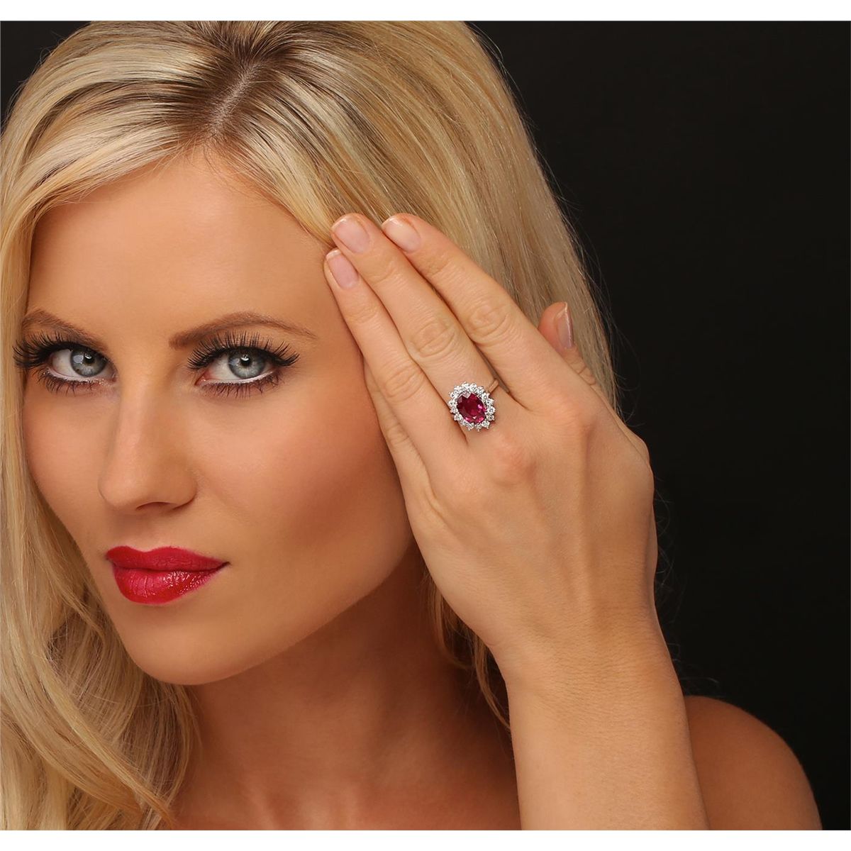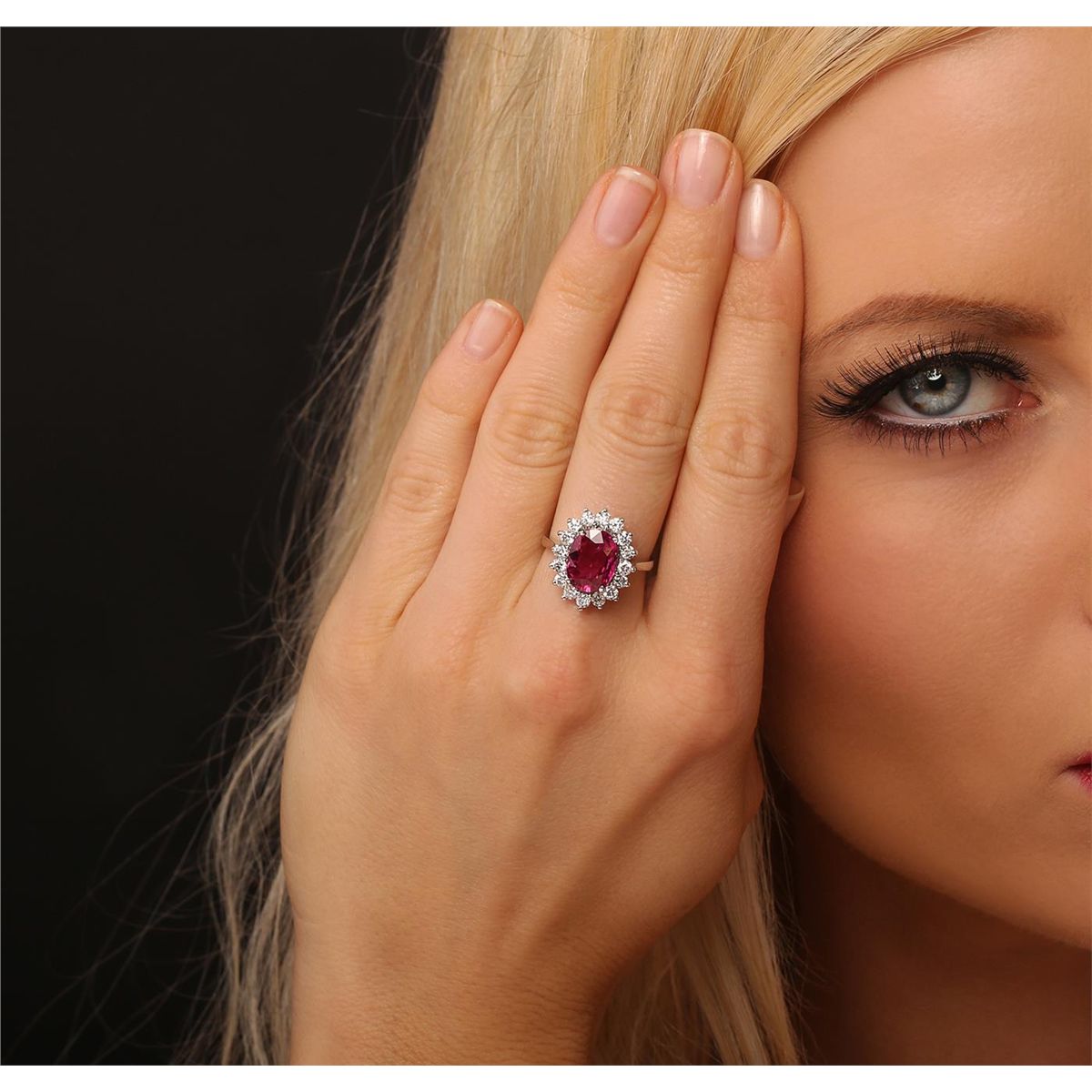 One electronically tested 14KT white gold ladies cast pink tourmaline and diamond ring with a bright polish finish. Condition is new, good workmanship. The featured pink tourmaline is set within a diamond bezel supported by tapering shoulders, completed by a two millimeter wide band. Identified with markings of "14K". Containing: One prong set oval mixed cut natural pink tourmaline, measuring 10.80 x 8.15 x 3.70mm, 10%. bulge factor, approximate weight of 2.42ct., clarity is moderately included, type II, medium, very slightly brownish, slightly purplish red color, (GIA slpR 5/3), cut is good. Transmitting light with a minimum of distortion, transparent. Naturally occurring internal & external characteristics are present. The color of this tourmaline is commonly irradiated in a laboratory to enhance the color. Evidence that may confirm this is typically lacking. Graded in the setting. Sixteen prong set round brilliant cut diamonds, measuring 2.50 - 2.50 x 1.50mm (depth est.) approximate. Total Weight of 16 Stones = 0.97ct. Graded in the setting. Clarity: SI-1 to I-1. Color: G - H. Total Weight of Colored Stones 2.42ct. Total Weight of Diamonds 0.97ct. Total Weight of Ring 4.57 grams. AIG Appraised at $4,600.00.