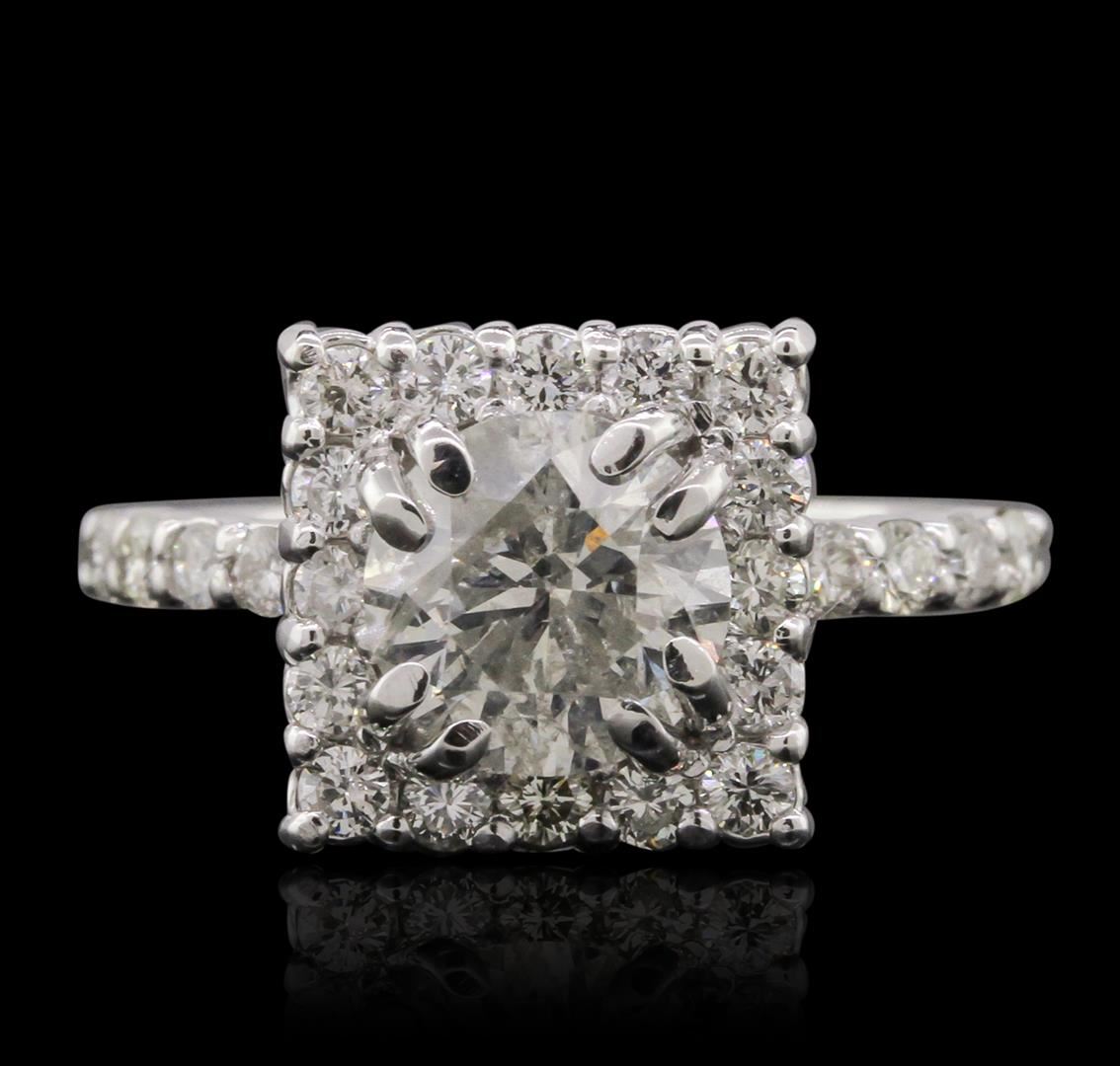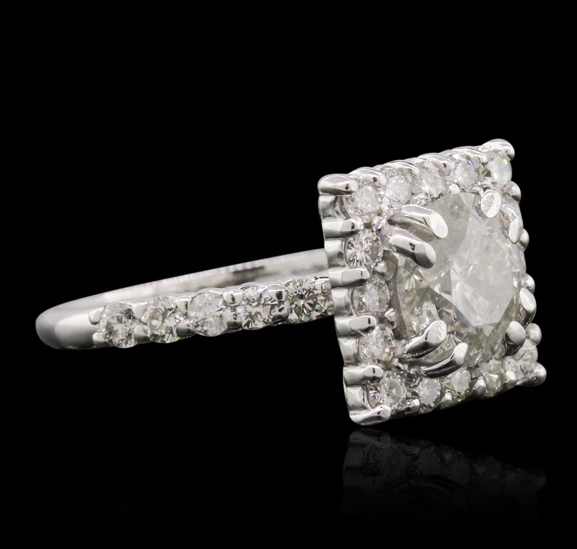 One electronically tested 14KT white gold Ladies combination cast & assembled engagement ring with a bright polish finish. Condition is new. Identified with markings of "14K". Containing: One prong set round brilliant cut diamond, measuring 7.50 - 7.50 x 4.86mm (depth est.) approximate weight of 1.67ct. Clarity: I-2. Color: K, Cut is Good. Twenty-Six bead set round brilliant cut diamonds, measuring 2.00. - 2.00. x 1.20mm (depth est.) approximate. Total Weight of 26 Stones = 0.76ct. Clarity: SI-1 to SI-2. Color: H - I, Cut is Good. Total Weight of Diamonds 2.43ct. Total Weight of Ring 4.40 grams. GGL Appraised at $16,055.00.