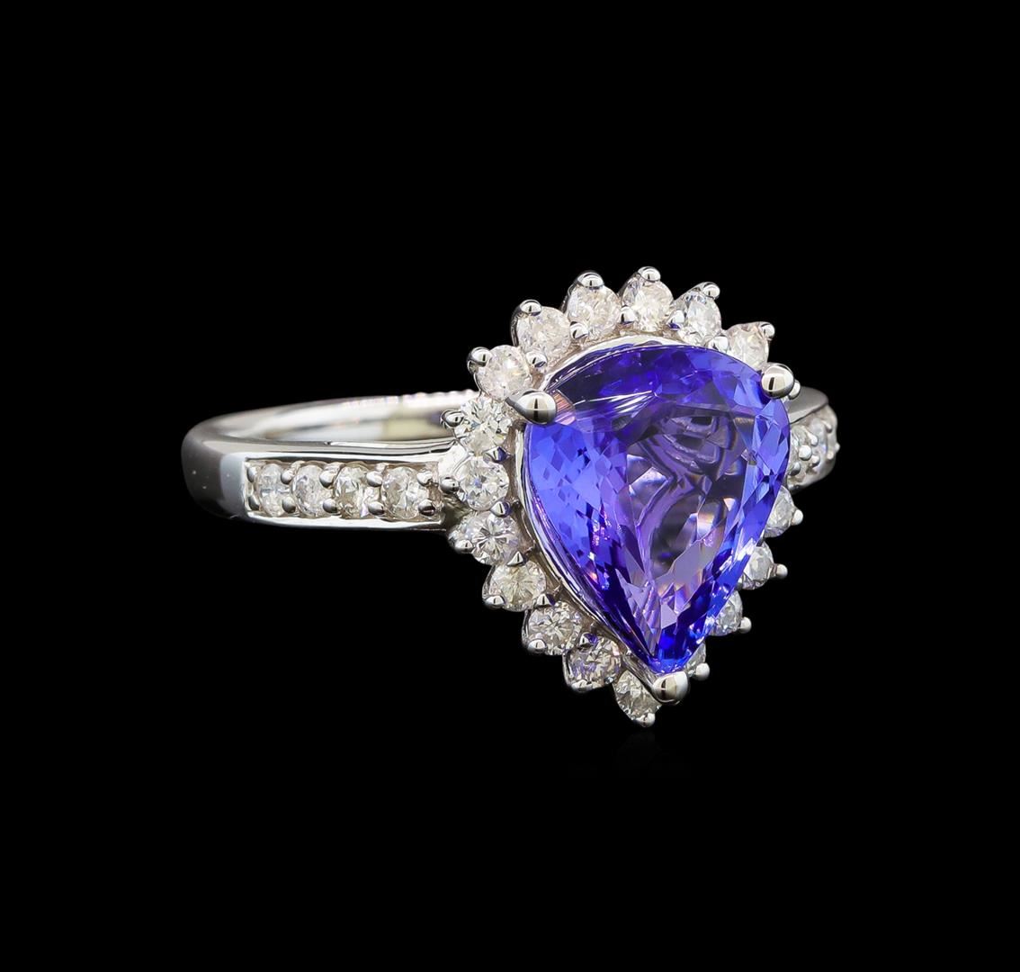 One electronically tested 14KT white gold ladies cast tanzanite and diamond ring with a flat shank with a bright polish finish. Trademark is Orianne. Identified with markings of "14K". Condition is new. Containing: One prong set pear modified brilliant cut natural tanzanite, measuring 9.45 x 8.74 x 4.40mm, approximate weight of 2.43ct., clarity is eye clean, type I, medium light, very slightly grayish, bluish violet color, (GIA bV 4/3), cut is good. Nineteen prong set round brilliant cut diamonds, measuring 1.70 - 1.50 x 0.96mm (depth est.) approximate total weight of 19 Stones = 0.53ct. Clarity: SI-2 to I-2. Color: I - J. All diamonds and colored gemstones are graded in the mounting, unless otherwise stated. Colored gemstones are presumed to have been subjected to commonly used enhancement processes. Total Weight of Colored Stones 2.43ct. Total Weight of Diamonds 0.53ct. Total Weight of Ring 3.60 grams. GGL Appraised at $3,345.00.