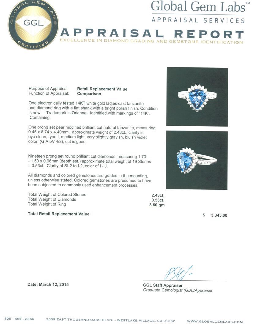 One electronically tested 14KT white gold ladies cast tanzanite and diamond ring with a flat shank with a bright polish finish. Trademark is Orianne. Identified with markings of "14K". Condition is new. Containing: One prong set pear modified brilliant cut natural tanzanite, measuring 9.45 x 8.74 x 4.40mm, approximate weight of 2.43ct., clarity is eye clean, type I, medium light, very slightly grayish, bluish violet color, (GIA bV 4/3), cut is good. Nineteen prong set round brilliant cut diamonds, measuring 1.70 - 1.50 x 0.96mm (depth est.) approximate total weight of 19 Stones = 0.53ct. Clarity: SI-2 to I-2. Color: I - J. All diamonds and colored gemstones are graded in the mounting, unless otherwise stated. Colored gemstones are presumed to have been subjected to commonly used enhancement processes. Total Weight of Colored Stones 2.43ct. Total Weight of Diamonds 0.53ct. Total Weight of Ring 3.60 grams. GGL Appraised at $3,345.00.