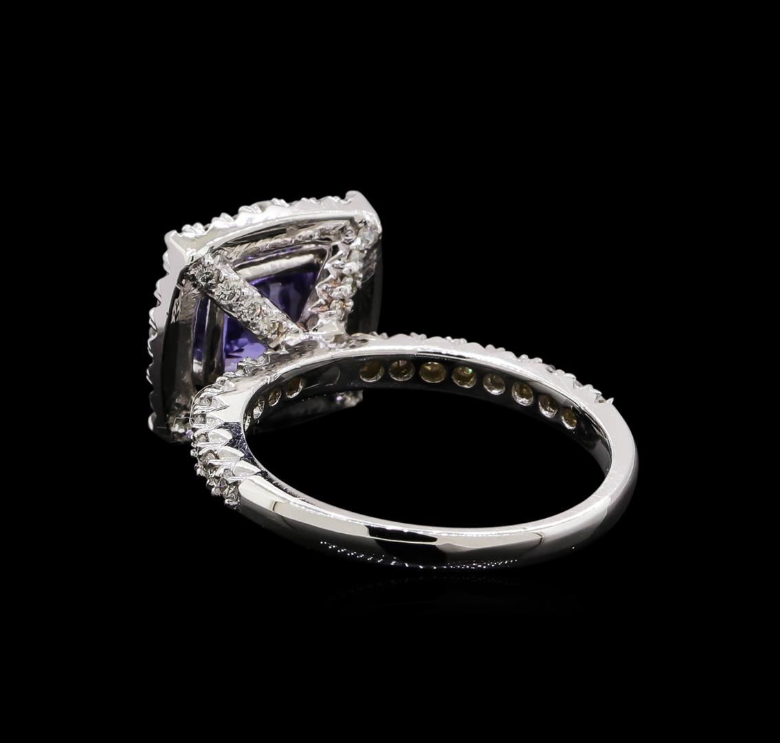 One electronically tested 14KT white gold ladies cast tanzanite and diamond ring with a bright polish finish. Identified with markings of "14K". Condition is new. Containing: One prong set square cushion modified brilliant cut natural tanzanite, measuring 7.80 x 7.80 x 5.07mm, approximate weight of 2.43ct., clarity is eye clean, type I, medium light, very slightly grayish, violet color, (GIA V 4/3), cut is good. Forty-Two prong set round brilliant cut diamonds, measuring 1.50 - 1.30 x 0.84mm (depth est.) approximate total weight of 42 Stones = 0.42ct. Clarity: SI-1 to I-1. Color: I - J, Cut is Good. Colored gemstones are presumed to have been subjected to commonly used enhancement processes. All diamonds and colored gemstones are graded in the mounting, unless otherwise stated. Total Weight of Colored Stones 2.43ct. Total Weight of Diamonds 0.42ct. Total Weight of Ring 5.60 grams. GGL Appraised.