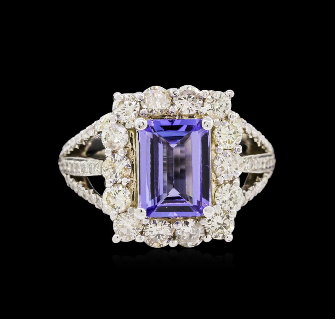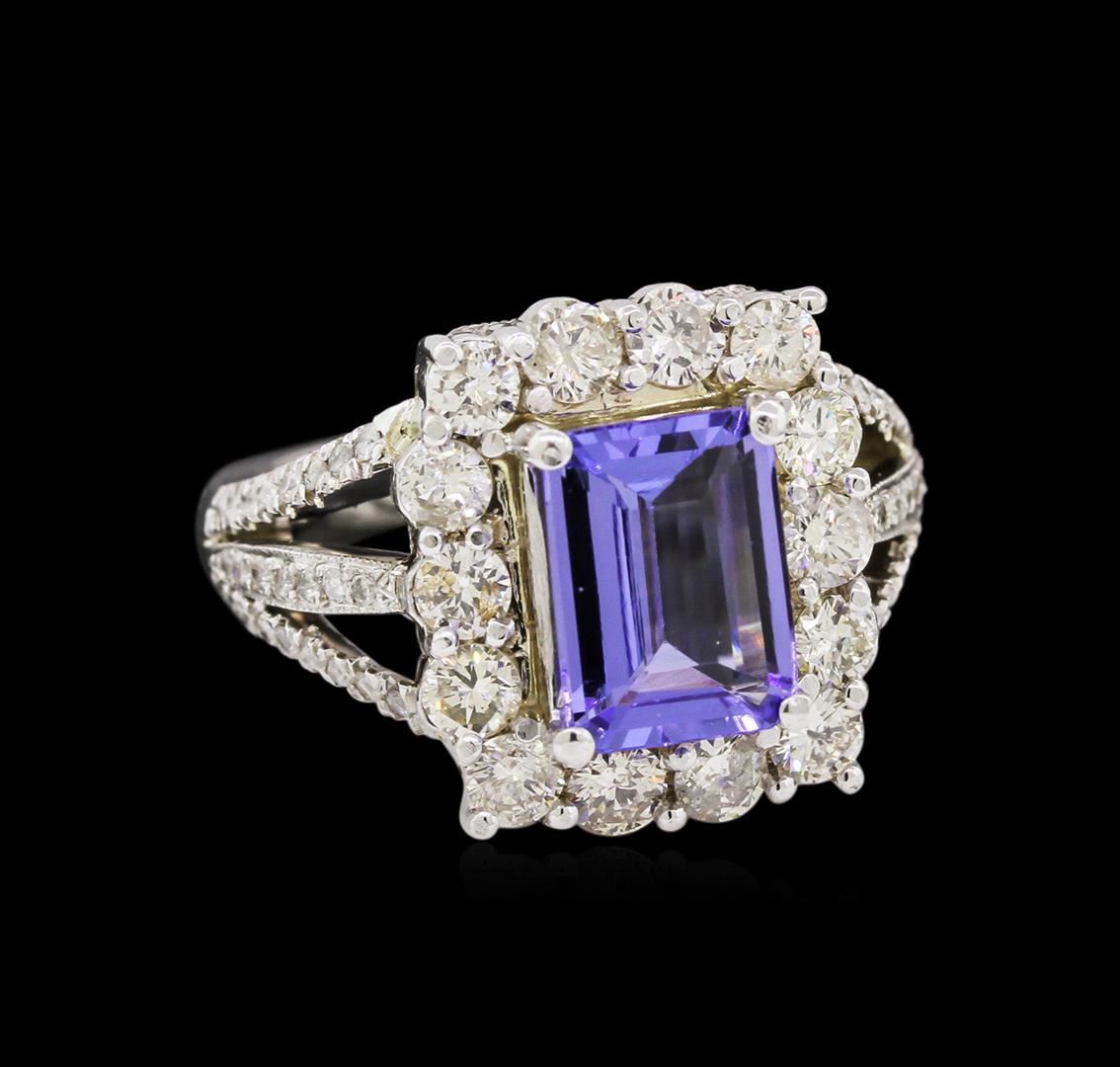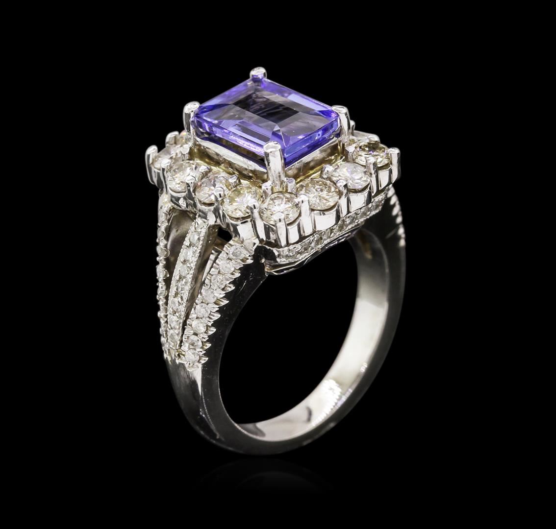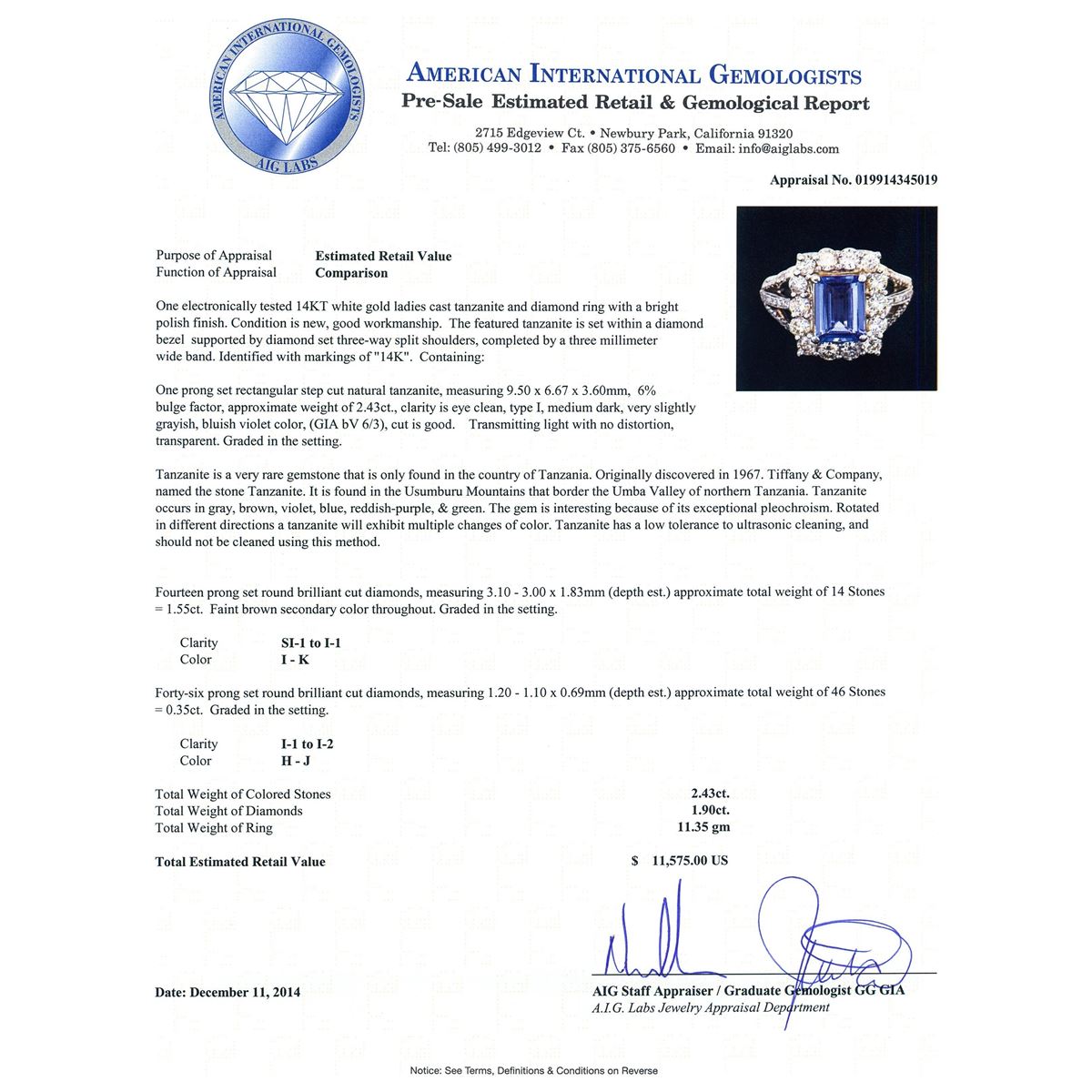 One electronically tested 14KT white gold ladies cast tanzanite and diamond ring with a bright polish finish. The featured tanzanite is set within a diamond bezel supported by diamond set three-way split shoulders, completed by a three millimeter wide band. Identified with markings of "14K". Condition is new, good workmanship. Containing: One prong set rectangular step cut natural tanzanite, measuring 9.50 x 6.67 x 3.60mm, 6% bulge factor, approximate weight of 2.43ct., clarity is eye clean, type I, medium dark, very slightly grayish, bluish violet color, (GIA bV 6/3), cut is good. Transmitting light with no distortion, transparent. Graded in the setting. Tanzanite is a very rare gemstone that is only found in the country of Tanzania. Originally discovered in 1967. Tiffany & Company, named the stone Tanzanite. It is found in the Usumburu Mountains that border the Umba Valley of northern Tanzania. Tanzanite occurs in gray, brown, violet, blue, reddish-purple, & green. The gem is interesting because of its exceptional pleochroism. Rotated in different directions a tanzanite will exhibit multiple changes of color. Tanzanite has a low tolerance to ultrasonic cleaning, and should not be cleaned using this method. Fourteen prong set round brilliant cut diamonds, measuring 3.10 - 3.00 x 1.83mm (depth est.) approximate total weight of 14 Stones = 1.55ct. Faint brown secondary color throughout. Graded in the setting. Clarity: SI-1 to I-1. Color: I - K Forty-Six prong set round brilliant cut diamonds, measuring 1.20 - 1.10 x 0.69mm (depth est.) approximate total weight of 46 Stones = 0.35ct. Graded in the setting. Clarity: I-1 to I-2. Color: H - J. Total Weight of Colored Stones 2.43ct. Total Weight of Diamonds 1.90ct. Total Weight of Ring 11.35 grams. AIG Appraised at $11,575.00.