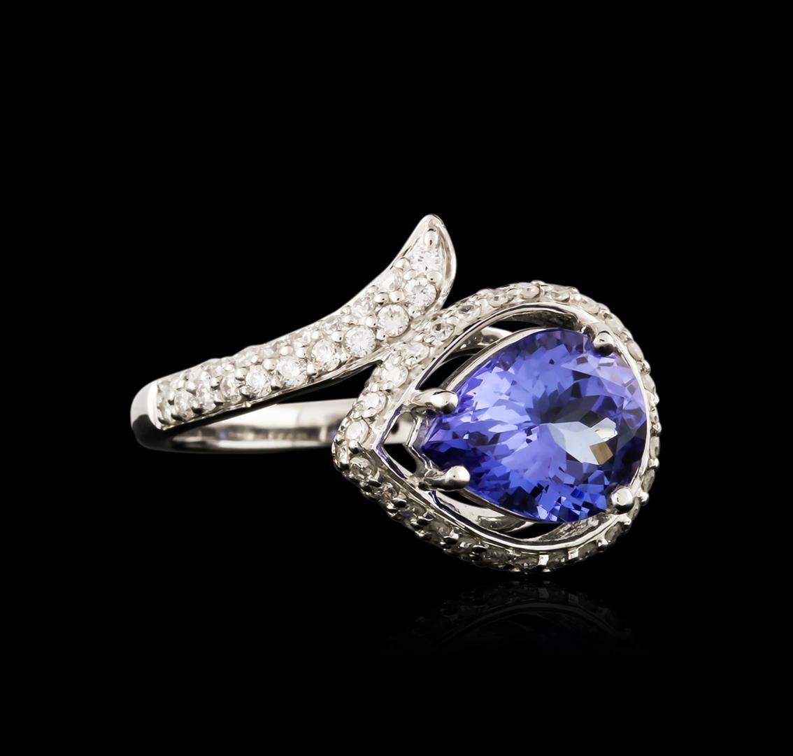 One electronically tested 14KT white gold ladies cast tanzanite and diamond ring with a bright polish finish. The featured tanzanite is set within a tiered diamond bezel supported by stylized diamond set shoulders, completed by a two millimeter wide band. Identified with markings of "14K". Condition is new, good workmanship. Containing: One prong set pear mixed cut natural tanzanite, measuring 9.80 x 7.65 x 4.60mm, 6%. bulge factor, approximate weight of 2.45ct., clarity is eye clean, type I, medium dark, very slightly grayish, violetish blue color, (GIA vB 6/3), cut is good. Transmitting light with no distortion, transparent. Graded in the setting. Tanzanite is a very rare gemstone that is only found in the country of Tanzania. Originally discovered in 1967. Tiffany & Company, named the stone Tanzanite. It is found in the Usumburu Mountains that border the Umba Valley of northern Tanzania. Tanzanite occurs in gray, brown, violet, blue, reddish-purple, & green. The gem is interesting because of its exceptional pleochroism. Rotated in different directions a tanzanite will exhibit multiple changes of color. Tanzanite has a low tolerance to ultrasonic cleaning, and should not be cleaned using this method. Ninety-Five prong set round brilliant cut diamonds, measuring 1.50 - 1.20 x 0.81mm (depth est.) approximate total weight of 95 Stones = 0.95ct. Graded in the setting. Clarity: VS-2 to SI-1. Color: G - I. Total Weight of Colored Stones 2.45ct. Total Weight of Diamonds 0.95ct. Total Weight of Ring 5.72 grams. AIG Appraised at $9,620.00.