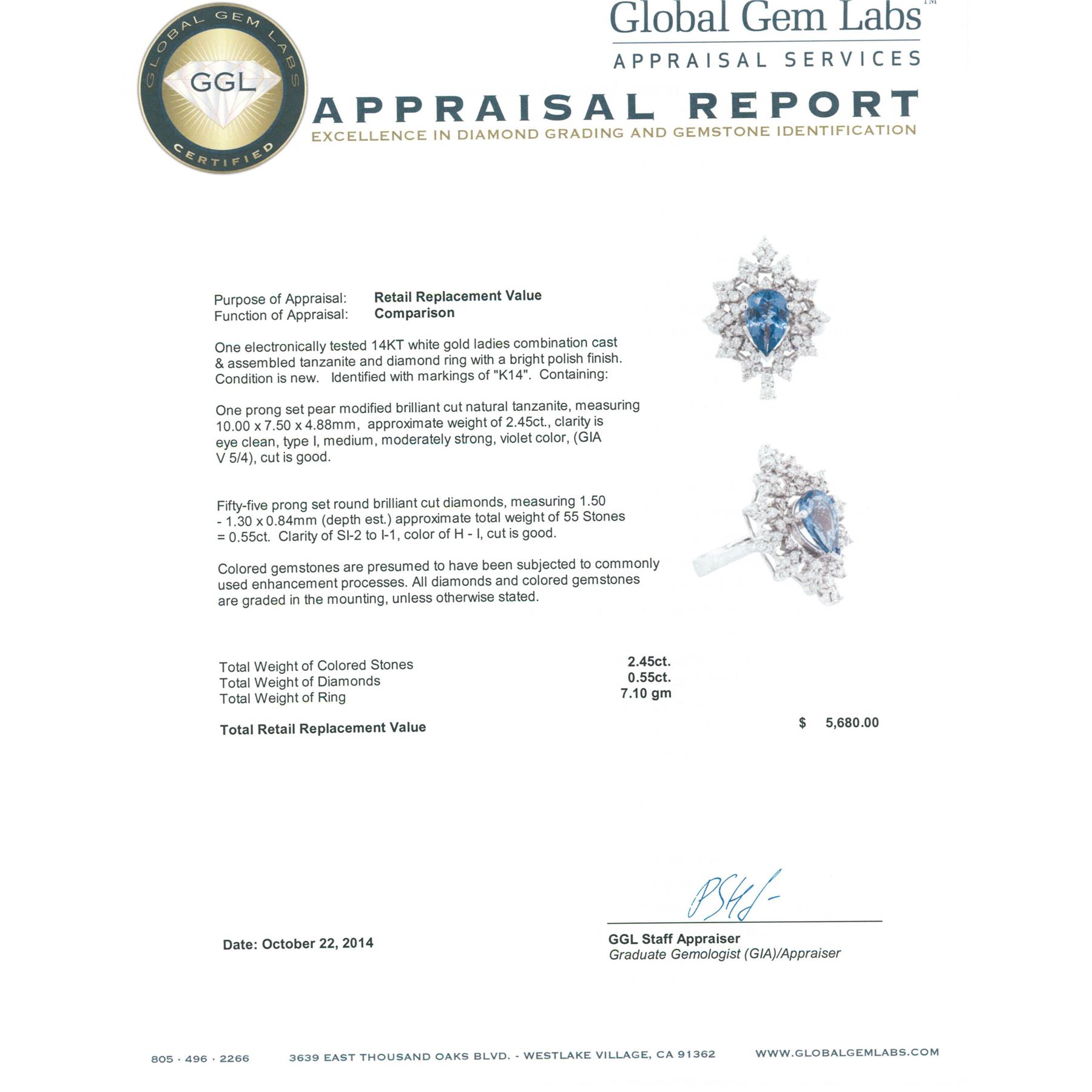 One electronically tested 14KT white gold ladies combination cast & assembled tanzanite and diamond ring with a bright polish finish. Identified with markings of "K14". Condition is new. Containing: One prong set pear modified brilliant cut natural tanzanite, measuring 10.00 x 7.50 x 4.88mm, approximate weight of 2.45ct., clarity is eye clean, type I, medium, moderately strong, violet color, (GIA V 5/4), cut is good. Fifty-Five prong set round brilliant cut diamonds, measuring 1.50 - 1.30 x 0.84mm (depth est.) approximate total weight of 55 Stones = 0.55ct. Clarity: SI-2 to I-1. Color: H - I, Cut is Good. Colored gemstones are presumed to have been subjected to commonly used enhancement processes. All diamonds and colored gemstones are graded in the mounting, unless otherwise stated. Total Weight of Colored Stones 2.45ct. Total Weight of Diamonds 0.55ct. Total Weight of Ring 7.10 grams. GGL Appraised at $5,680.00.