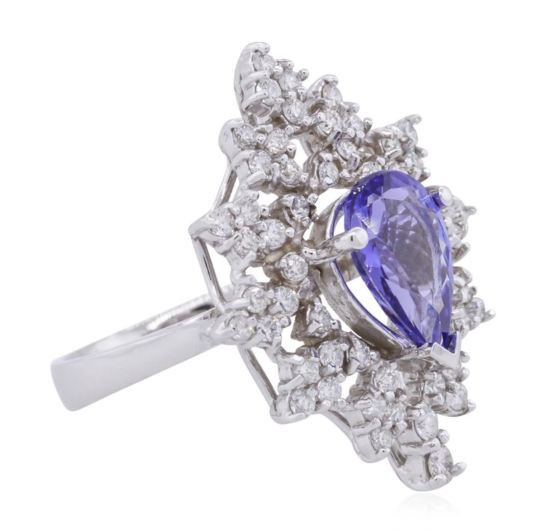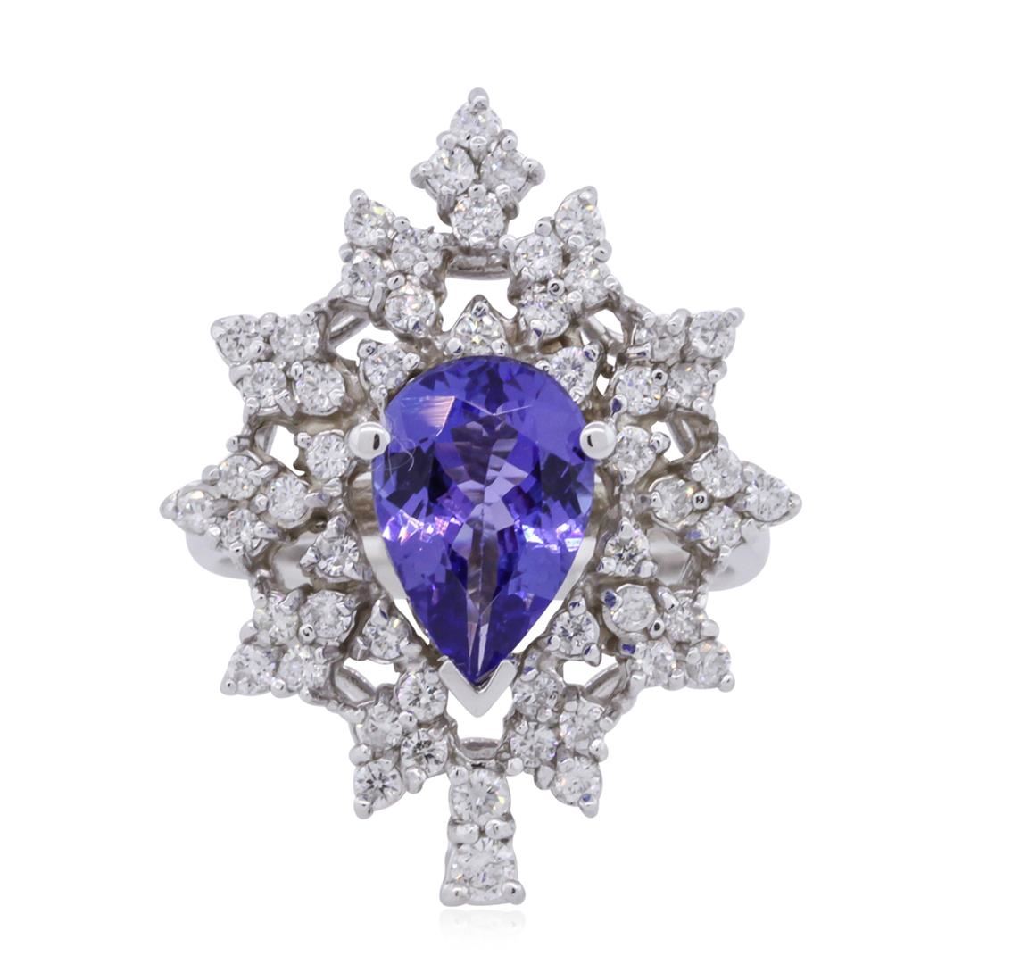 One electronically tested 14KT white gold ladies combination cast & assembled tanzanite and diamond ring with a bright polish finish. Identified with markings of "K14". Condition is new. Containing: One prong set pear modified brilliant cut natural tanzanite, measuring 10.00 x 7.50 x 4.88mm, approximate weight of 2.45ct., clarity is eye clean, type I, medium, moderately strong, violet color, (GIA V 5/4), cut is good. Fifty-Five prong set round brilliant cut diamonds, measuring 1.50 - 1.30 x 0.84mm (depth est.) approximate total weight of 55 Stones = 0.55ct. Clarity: SI-2 to I-1. Color: H - I, Cut is Good. Colored gemstones are presumed to have been subjected to commonly used enhancement processes. All diamonds and colored gemstones are graded in the mounting, unless otherwise stated. Total Weight of Colored Stones 2.45ct. Total Weight of Diamonds 0.55ct. Total Weight of Ring 7.10 grams. GGL Appraised at $5,680.00.