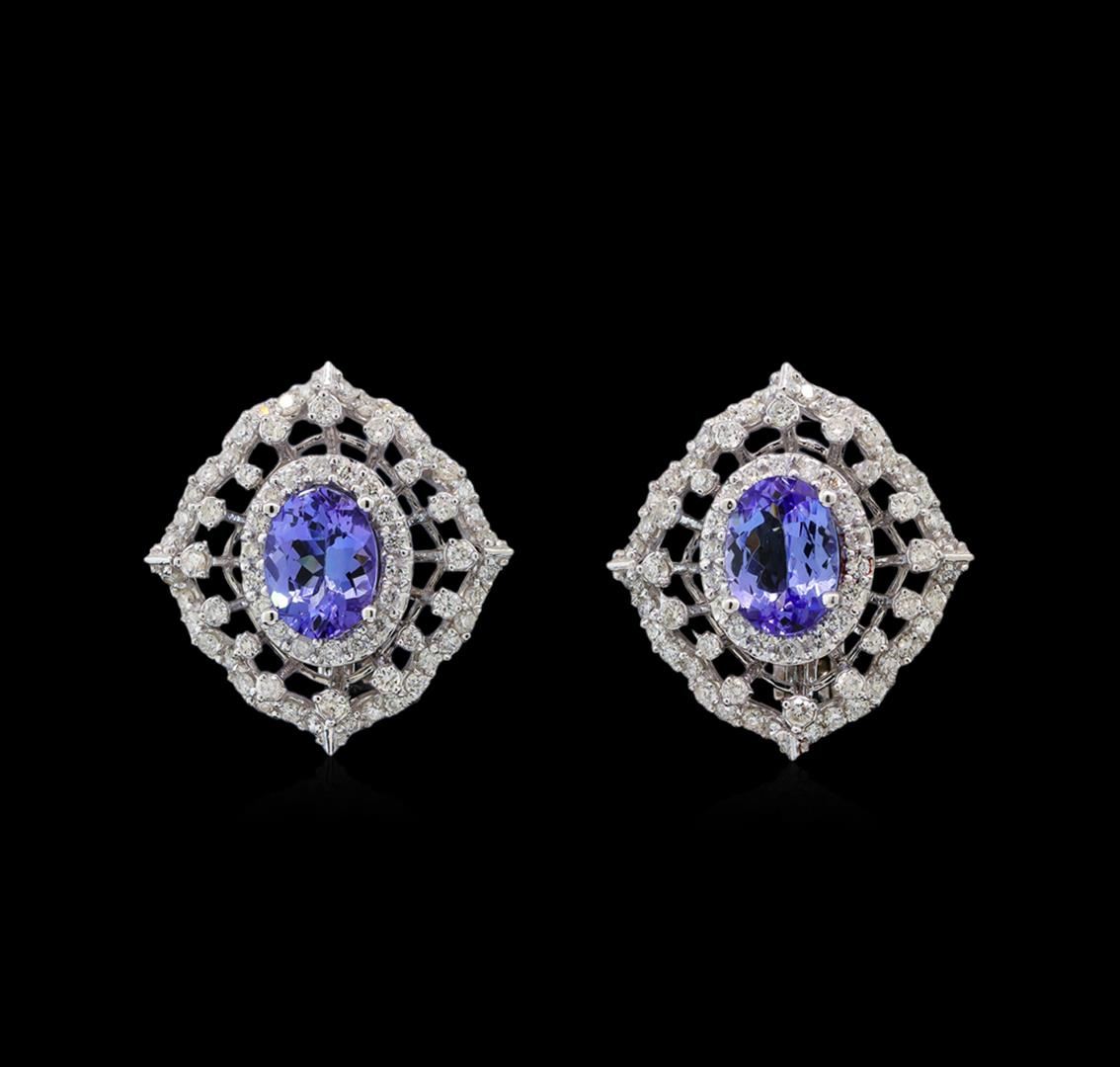 One pair electronically tested 14KT white gold ladies cast tanzanite and diamond earrings with Omega clip backs with a bright polish finish. Condition is new. Containing: Two prong set oval modified brilliant cut natural tanzanites, measuring 8.00. x 5.80 x 3.77mm, approximate total weight of 2.46ct., clarity is eye clean, type I, medium light, very slightly grayish, violet color, (GIA V 4/3), cut is good. One Hundred Sixty-Eight prong set round brilliant cut diamonds, measuring 1.50 - 1.20 x 0.81mm (depth est.) approximate total weight of 168 Stones = 1.51ct. Clarity: SI-2 to I-1. Color: I - J, Cut is Good. Colored gemstones are presumed to have been subjected to commonly used enhancement processes. All diamonds and colored gemstones are graded in the mounting, unless otherwise stated. Total Weight of Colored Stones 2.46ct. Total Weight of Diamonds 1.51ct. Total Weight of Earrings 8.00. grams. GGL Appraised at $4,630.00.