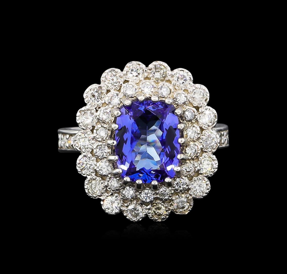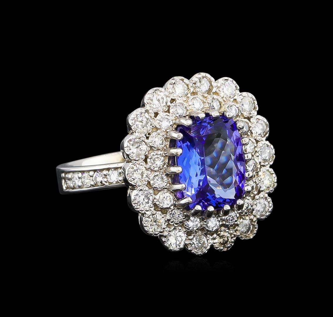 One electronically tested 14KT white gold Ladies combination cast & assembled ring with a bright polish finish. Condition is new. Identified with markings of "K14". Containing: One prong set rectangular cushion modified brilliant cut natural tanzanite, measuring 10.00 x 8.00 x 3.90mm, approximate weight of 2.46ct., clarity is eye clean, type I, medium light, very slightly grayish, violet color, (GIA V 4/3), cut is very good. Colored gemstones are presumed to have been subjected to commonly used color/clarity enhancement processes. Forty-Eight prong set round brilliant cut diamonds, measuring 1.80 - 1.50 x 0.55mm (depth est.) approximate. Total Weight of 48 Stones = 0.44ct. Clarity: I-1 to I-2. Color: J - K, Cut is Good. Total Weight of Colored Stones 2.46ct. Total Weight of Diamonds 0.44ct. Total Weight of Ring 7.20 grams. GGL Appraised at $6,265.00.