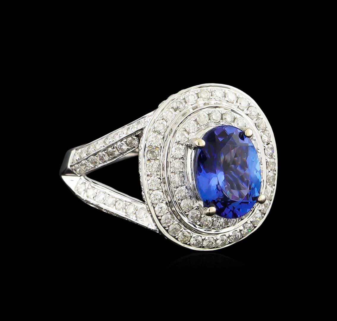 One electronically tested 14KT white gold ladies combination cast & assembled tanzanite and diamond ring with a split shank with a bright polish finish. Identified with markings of "14K". Condition is new. Containing: One prong set oval modified brilliant cut natural tanzanite, measuring 9.78 x 7.54 x 4.90mm, approximate weight of 2.46ct., clarity is eye clean, type I, medium, moderately strong, violet color, (GIA V 5/4), cut is good. One Hundred Twenty-Six prong set round brilliant cut diamonds, measuring 1.20 - 1.20 x 0.72mm (depth est.) approximate total weight of 126 Stones = 0.79ct. Clarity: I-1 to I-2. Color: I - J, Cut is Good. Colored gemstones are presumed to have been subjected to commonly used enhancement processes. All diamonds and colored gemstones are graded in the mounting, unless otherwise stated. Total Weight of Colored Stones 2.46ct. Total Weight of Diamonds 0.79ct. Total Weight of Ring 7.00 grams. GGL Appraised at $6,840.00.