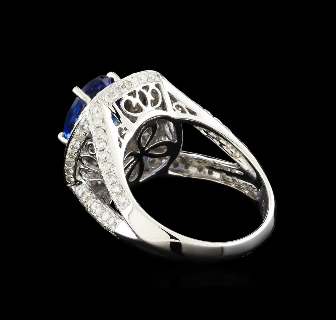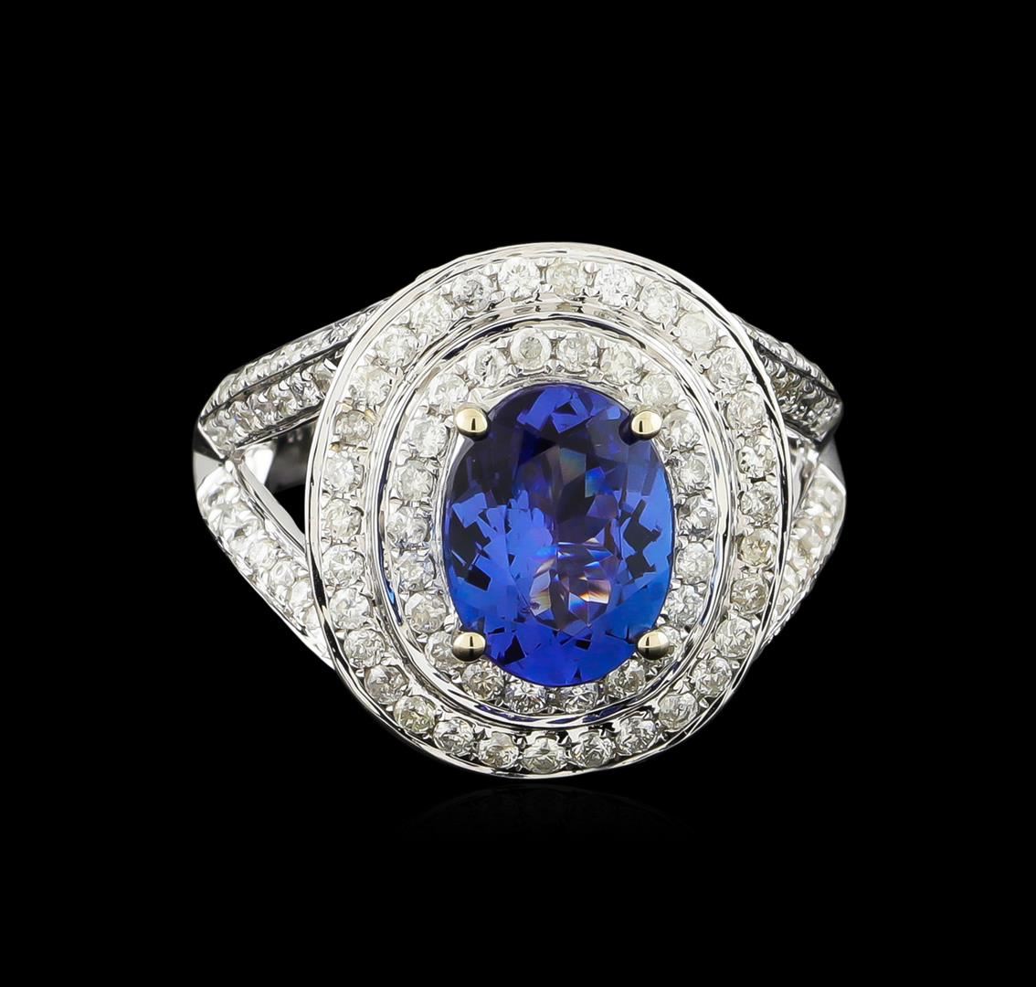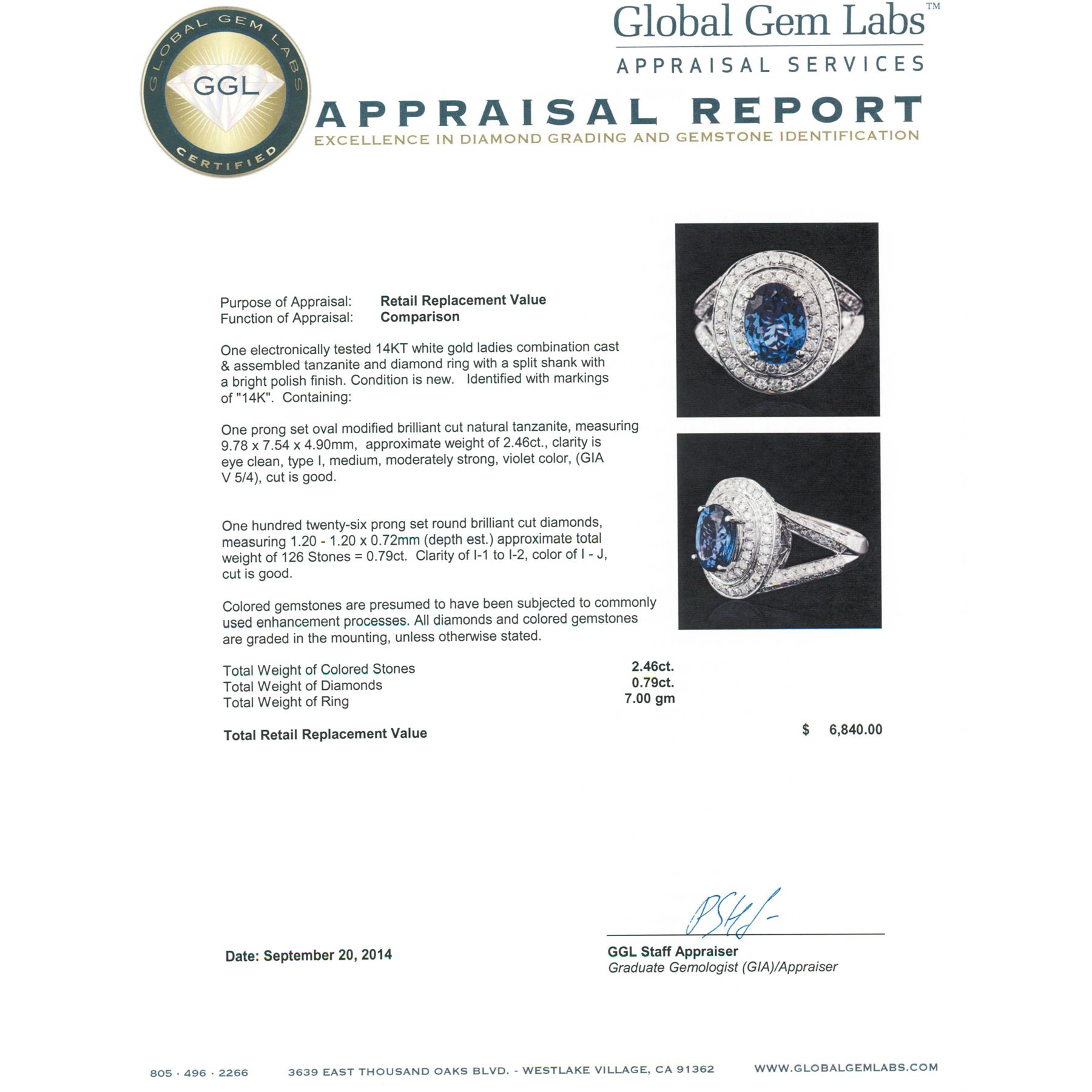 One electronically tested 14KT white gold ladies combination cast & assembled tanzanite and diamond ring with a split shank with a bright polish finish. Identified with markings of "14K". Condition is new. Containing: One prong set oval modified brilliant cut natural tanzanite, measuring 9.78 x 7.54 x 4.90mm, approximate weight of 2.46ct., clarity is eye clean, type I, medium, moderately strong, violet color, (GIA V 5/4), cut is good. One Hundred Twenty-Six prong set round brilliant cut diamonds, measuring 1.20 - 1.20 x 0.72mm (depth est.) approximate total weight of 126 Stones = 0.79ct. Clarity: I-1 to I-2. Color: I - J, Cut is Good. Colored gemstones are presumed to have been subjected to commonly used enhancement processes. All diamonds and colored gemstones are graded in the mounting, unless otherwise stated. Total Weight of Colored Stones 2.46ct. Total Weight of Diamonds 0.79ct. Total Weight of Ring 7.00 grams. GGL Appraised at $6,840.00.