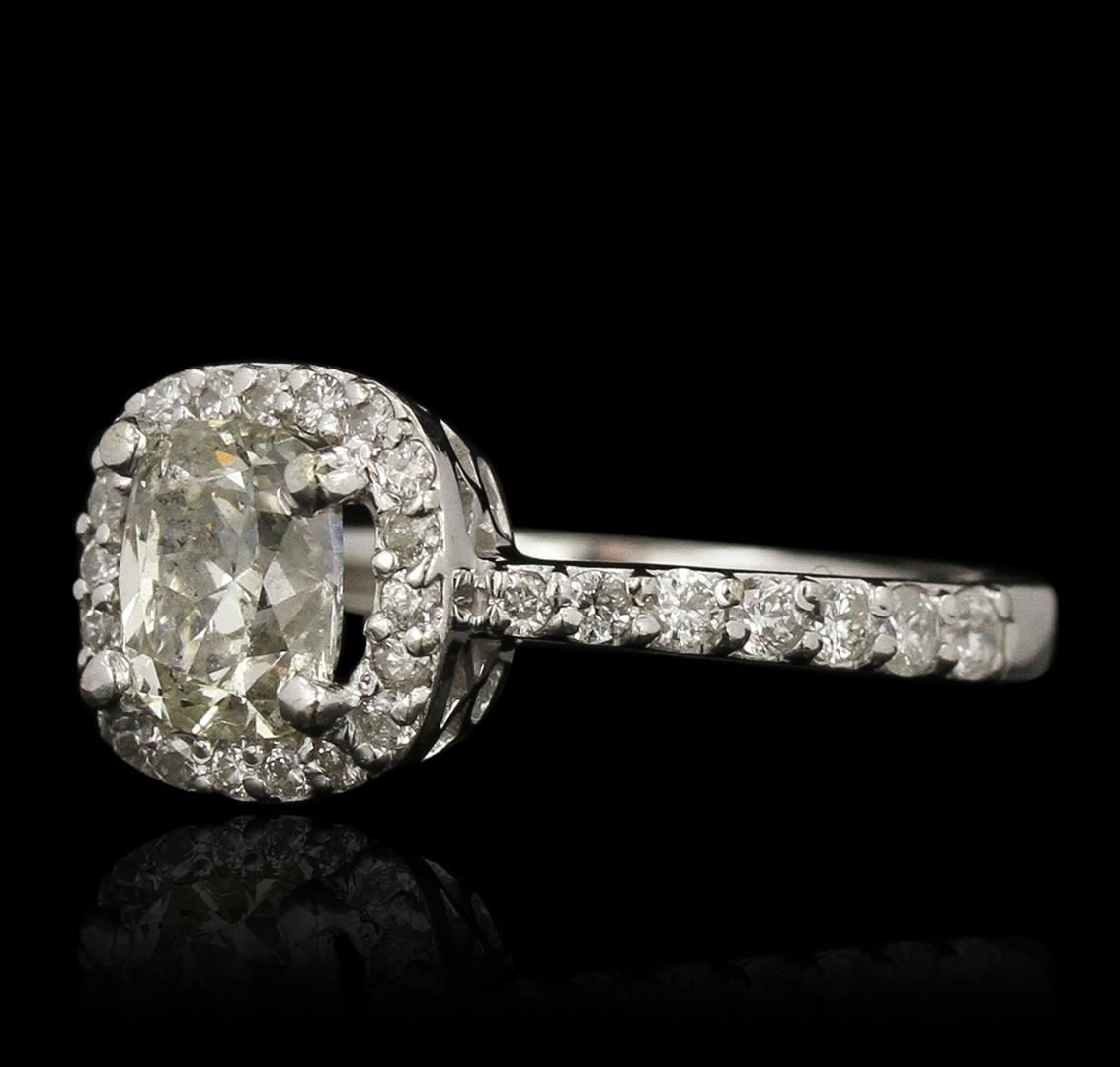One electronically tested 14KT white gold ladies cast diamond ring with a bright polish finish. Condition is new, good workmanship. The featured diamond is set within a diamond bezel, supported by diamond set shoulders and completed by a two and one-half millimeter wide band. Identified with markings of "14K". Containing: One prong set cushion cut diamond, measuring 7.00 x 6.40 x 4.30mm approximate weight of 1.81ct, clarity enhanced with a strong blue fluorescence. Diamond Grading Report attached. Graded in the setting. Clarity: I-1. Color: L Depth 67.2%. Table 48.4%. Thirty-Four prong set round brilliant cut diamonds, measuring 2.00 - 1.50 x 1.05mm (depth est.) approximate. Total Weight of 34 Stones = 0.66ct. Graded in the setting. Clarity: SI-2 to I-1. Color: H - J. Total Weight of Diamonds 2.47ct. Total Weight of Ring 4.30 grams. AIG Appraised at $12,600.00.