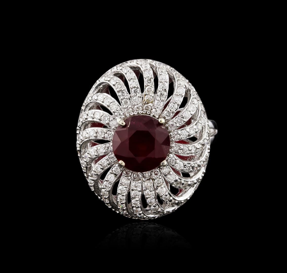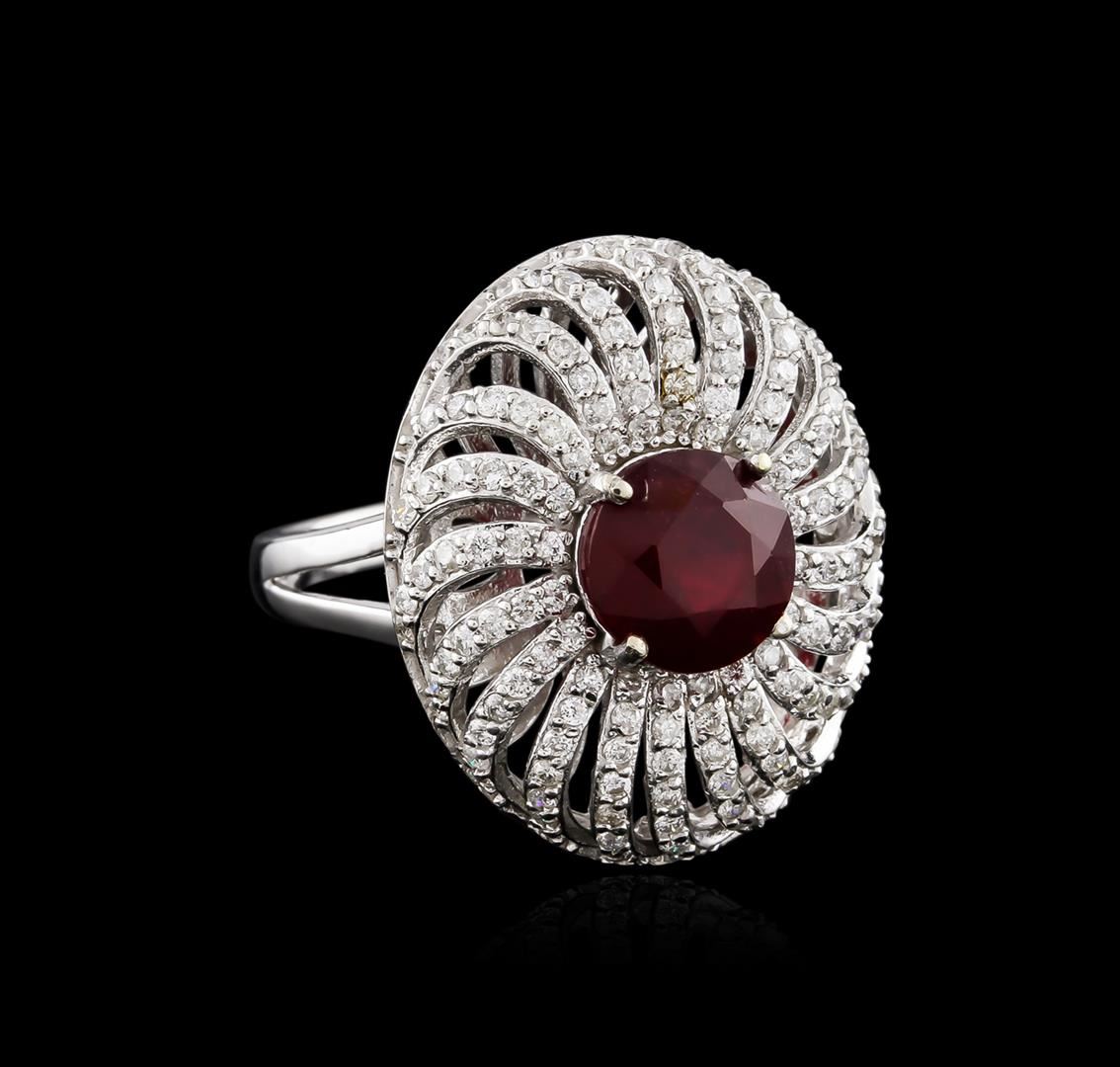 One electronically tested 14KT white gold ladies cast ruby and diamond ring with a bright polish finish. Identified with markings of "K14". Condition is new. Containing: One prong set round modified brilliant cut natural ruby, measuring 7.80 - 7.80 x 5.07 mm, approximate weight of 2.47ct., clarity is heavily included, type II, medium dark, moderately strong, strongly purplish red color, (GIA stpR 6/4), cut is good. One Hundred Forty-Eight prong set round brilliant cut diamonds, measuring 1.10 - 1.10 x 0.66mm (depth est.) approximate total weight of 148 Stones = 0.71ct. Clarity of SI-2 to I-1, Color of I - J, Cut is Good. All diamonds and colored gemstones are graded in the mounting, unless otherwise stated. Colored gemstones are presumed to have been subjected to commonly used enhancement processes. Total Weight of Colored Stones 2.47ct. Total Weight of Diamonds 0.71ct. Total Weight of Ring 8.20 grams. GGL Appraised at $3,940.00.