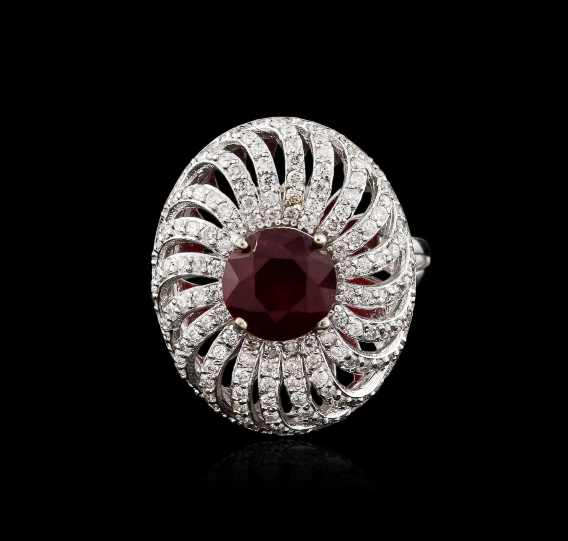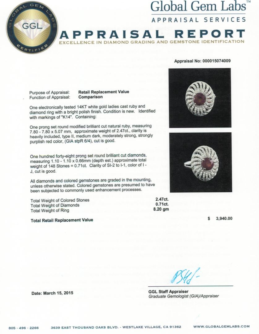 One electronically tested 14KT white gold ladies cast ruby and diamond ring with a bright polish finish. Identified with markings of "K14". Condition is new. Containing: One prong set round modified brilliant cut natural ruby, measuring 7.80 - 7.80 x 5.07 mm, approximate weight of 2.47ct., clarity is heavily included, type II, medium dark, moderately strong, strongly purplish red color, (GIA stpR 6/4), cut is good. One Hundred Forty-Eight prong set round brilliant cut diamonds, measuring 1.10 - 1.10 x 0.66mm (depth est.) approximate total weight of 148 Stones = 0.71ct. Clarity of SI-2 to I-1, Color of I - J, Cut is Good. All diamonds and colored gemstones are graded in the mounting, unless otherwise stated. Colored gemstones are presumed to have been subjected to commonly used enhancement processes. Total Weight of Colored Stones 2.47ct. Total Weight of Diamonds 0.71ct. Total Weight of Ring 8.20 grams. GGL Appraised at $3,940.00.