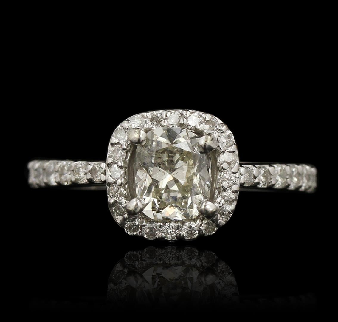 One electronically tested 14KT white gold ladies cast diamond ring with a bright polish finish. Condition is new, good workmanship. The featured diamond is set within a diamond bezel, supported by diamond set shoulders and completed by a two and one-half millimeter wide band. Identified with markings of "14K". Containing: One prong set cushion cut diamond, measuring 7.00 x 6.40 x 4.30mm approximate weight of 1.81ct, clarity enhanced with a strong blue fluorescence. Diamond Grading Report attached. Graded in the setting. Clarity: I-1. Color: L Depth 67.2%. Table 48.4%. Thirty-Four prong set round brilliant cut diamonds, measuring 2.00 - 1.50 x 1.05mm (depth est.) approximate. Total Weight of 34 Stones = 0.66ct. Graded in the setting. Clarity: SI-2 to I-1. Color: H - J. Total Weight of Diamonds 2.47ct. Total Weight of Ring 4.30 grams. AIG Appraised at $12,600.00.