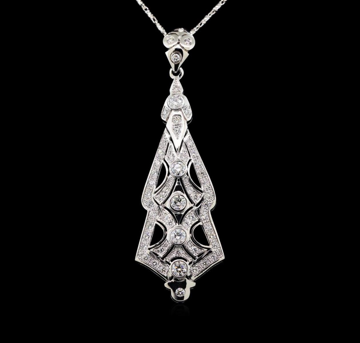 One electronically tested 14KT white gold ladies cast diamond pendant & chain 18.0" long, with a lobster claw clasp with a bright polish finish. Identified with markings of "14K". Condition is new. Containing: Five bezel set round brilliant cut diamonds, measuring 4.30 - 4.30 x 2.58mm (depth est.) approximate total weight of 5 Stones = 1.46ct. Clarity: I-1. Color: I - J, Cut is Good. Forty-Eight bezel set round brilliant cut diamonds, measuring 1.80 - 1.80 x 1.08mm (depth est.) approximate total weight of 48 Stones = 1.02ct. Clarity: SI-1 to SI-2. Color: I - K, Cut is Good. All diamonds are graded in the mounting, unless otherwise stated. Total Weight of Diamonds 2.48ct. Total Weight of Pendant & Chain 17.00 grams. GGL Appraised.
