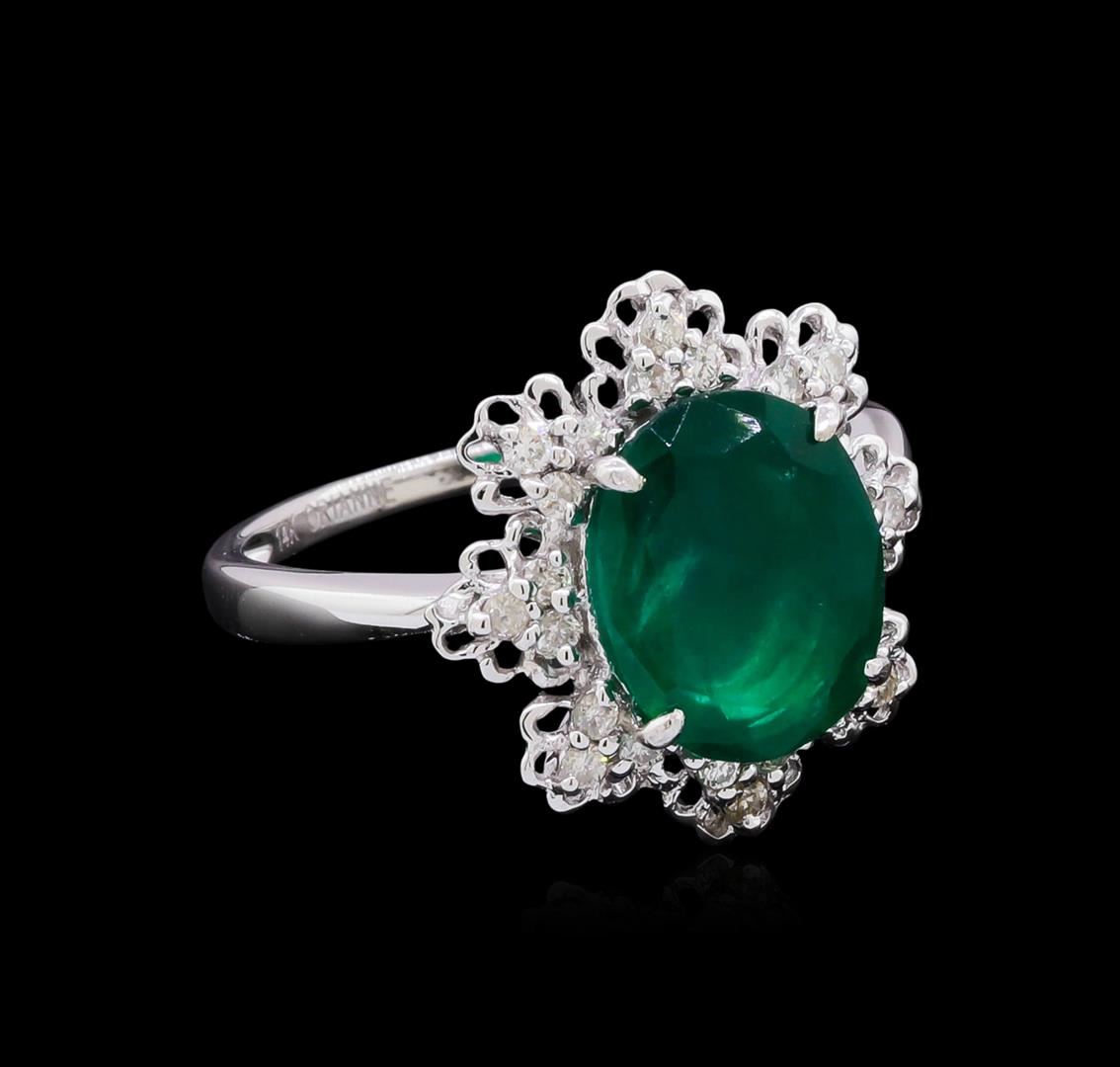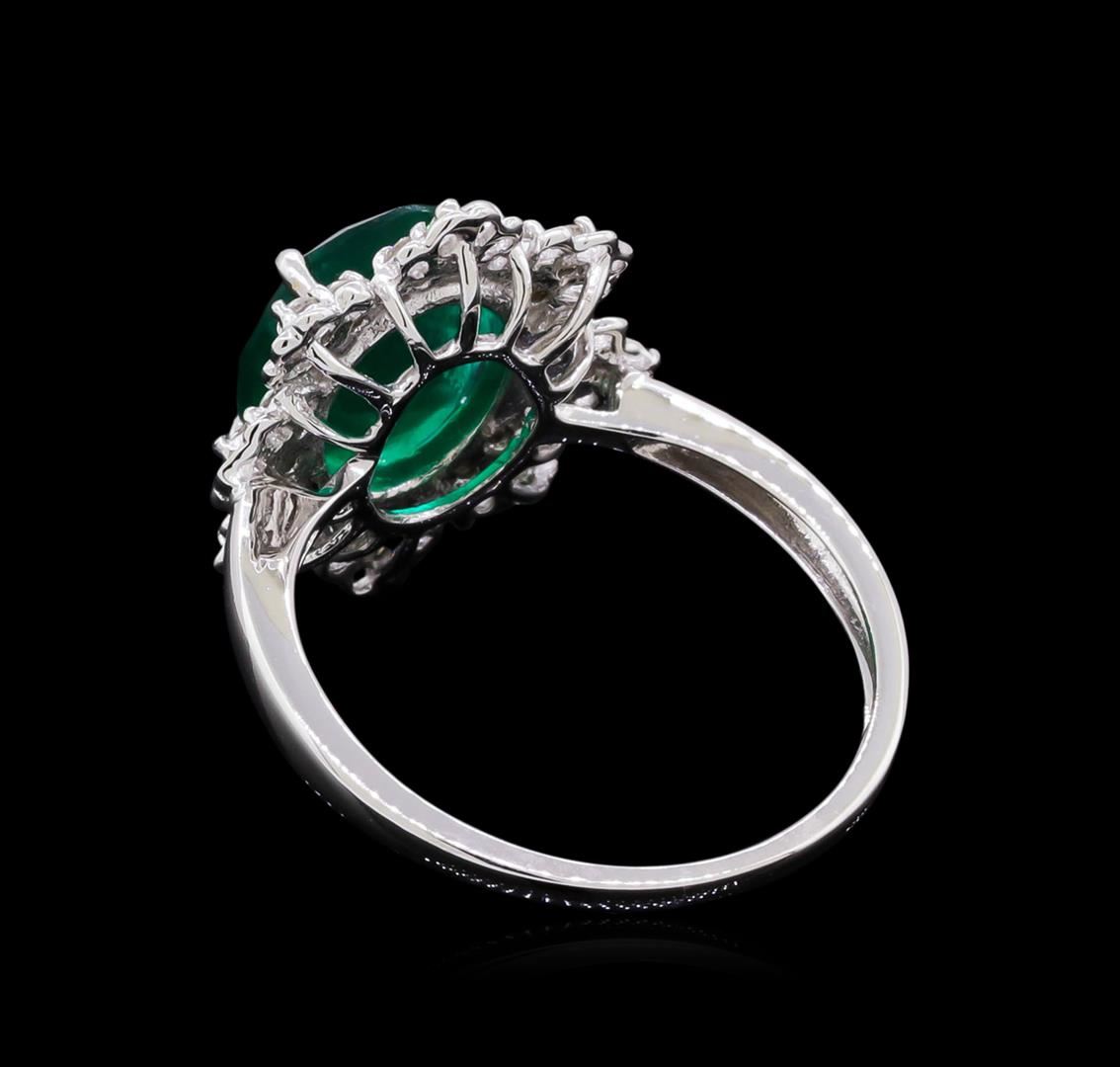 One electronically tested 14KT white gold Ladies combination cast & assembled cocktail ring with a bright polish finish. Identified with markings of "14K". Condition is excellent. Containing: One prong set oval modified brilliant cut natural emerald, measuring 10.60 x 8.40 x 3.90mm, approximate weight of 2.48ct., clarity is heavily included, type III, medium dark, moderately strong, green color, (GIA G 6/4), cut is good. Colored gemstones are presumed to have been subjected to commonly used and possible undetectable color/clarity enhancement processes. Twenty-Four prong set round brilliant cut diamonds, measuring 1.30 - 1.30 x 0.78mm (depth est.) approximate total weight of 24 Stones = 0.26ct. Clarity of I-1, Color of J. Total Weight of Colored Stones 2.48ct. Total Weight of Diamonds 0.26ct. Total Weight of Ring 3.40gm. GGL Appraised at $5,985.00.