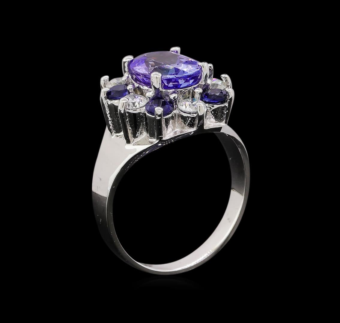 One electronically tested 14KT white gold ladies cast tanzinite, sapphire and diamond ring with a bright polish finish. Identified with markings of "K14". Condition is new. Containing: One prong set oval modified brilliant cut natural tanzanite, measuring 9.40 x 7.60 x 4.94mm, approximate weight of 2.48ct., clarity is eye clean, type I, medium light, very slightly grayish, violet color, (GIA V 4/3), cut is good. Five prong set round modified brilliant cut natural blue sapphires, measuring 2.80 - 2.80 x 1.82 mm, approximate total weight of 0.55ct., clarity is slightly included, type II, medium, moderately strong, blue color, (GIA B 5/4), cut is good. Five prong set round brilliant cut diamonds, measuring 3.10 - 3.10 x 1.86mm (depth est.) approximate total weight of 5 Stones = 0.55ct. Clarity: SI-1 to SI-2. Color: I - J, Cut is Good. Colored gemstones are presumed to have been subjected to commonly used enhancement processes. All diamonds and colored gemstones are graded in the mounting, unless otherwise stated. Total Weight of Colored Stones 3.03ct. Total Weight of Diamonds 0.55ct. Total Weight of Ring 5.70 grams. GGL Appraised at $3,875.00.