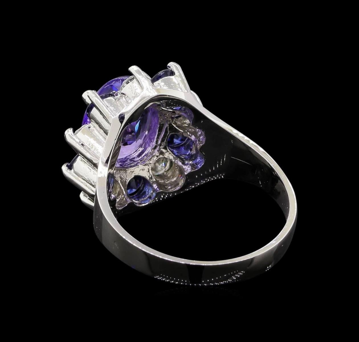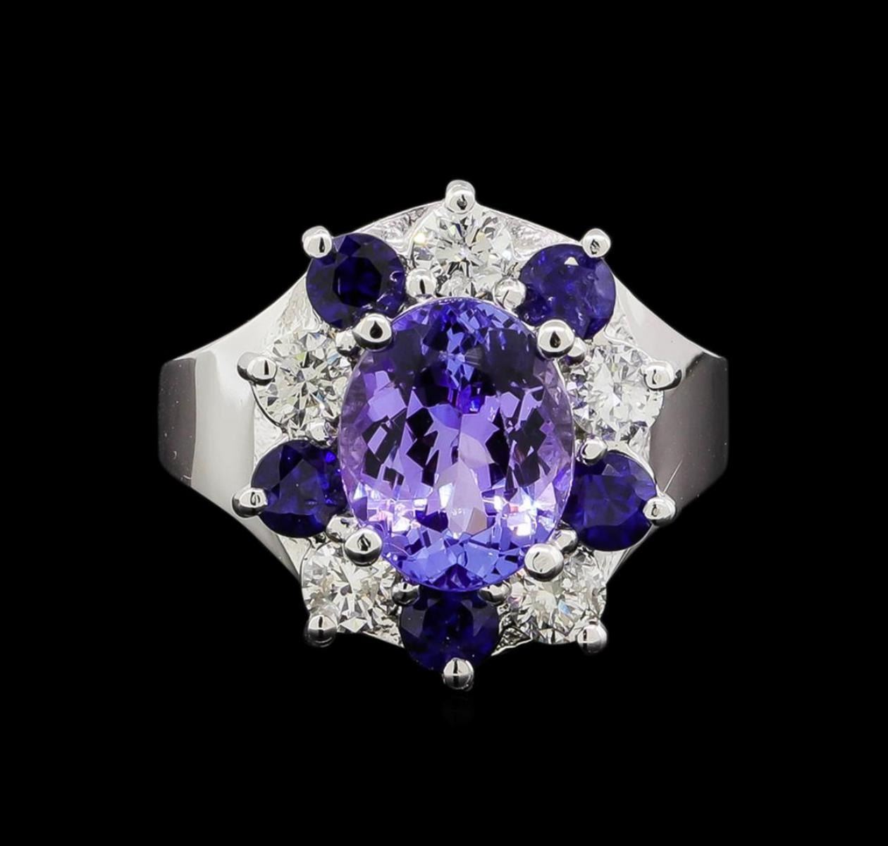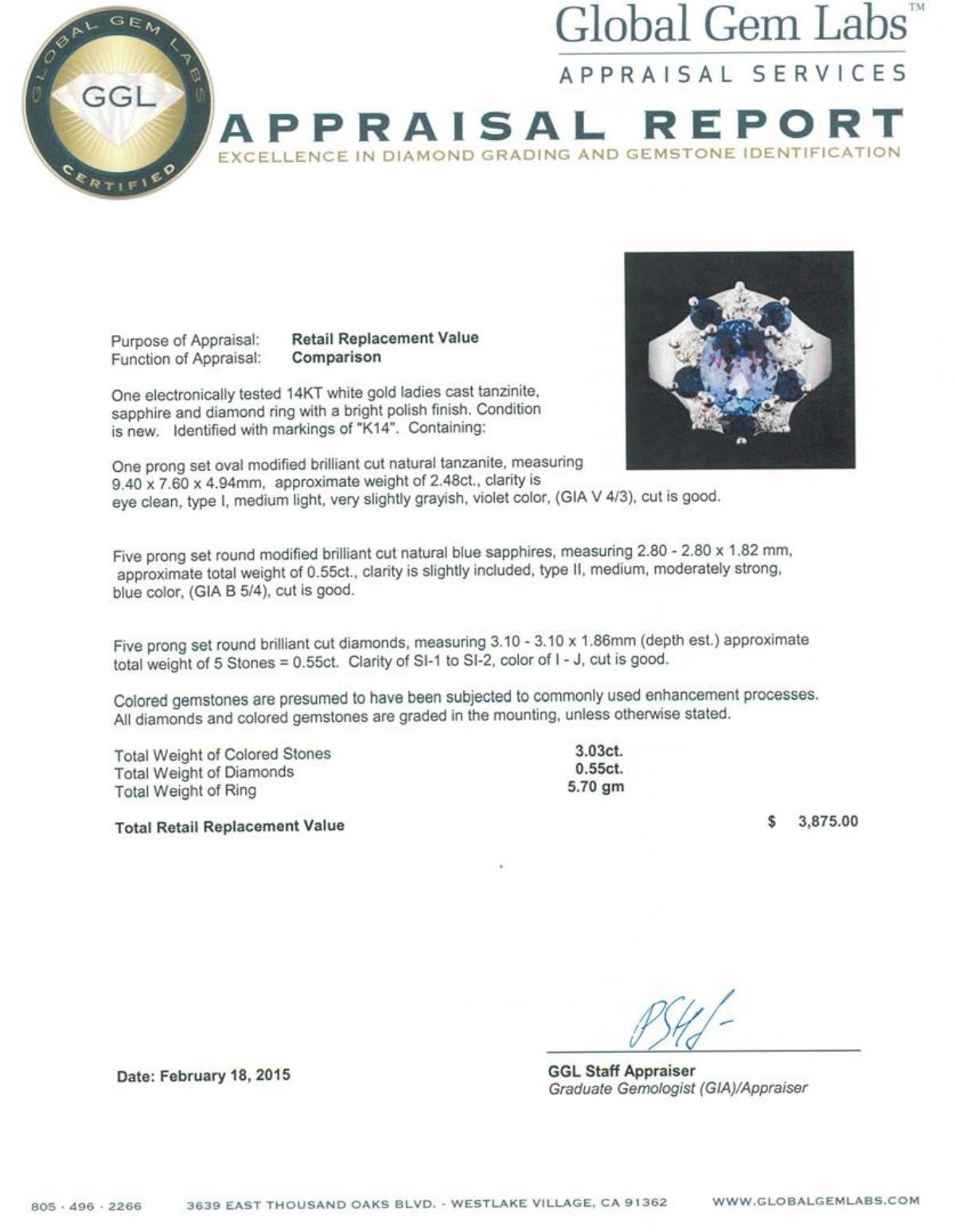 One electronically tested 14KT white gold ladies cast tanzinite, sapphire and diamond ring with a bright polish finish. Identified with markings of "K14". Condition is new. Containing: One prong set oval modified brilliant cut natural tanzanite, measuring 9.40 x 7.60 x 4.94mm, approximate weight of 2.48ct., clarity is eye clean, type I, medium light, very slightly grayish, violet color, (GIA V 4/3), cut is good. Five prong set round modified brilliant cut natural blue sapphires, measuring 2.80 - 2.80 x 1.82 mm, approximate total weight of 0.55ct., clarity is slightly included, type II, medium, moderately strong, blue color, (GIA B 5/4), cut is good. Five prong set round brilliant cut diamonds, measuring 3.10 - 3.10 x 1.86mm (depth est.) approximate total weight of 5 Stones = 0.55ct. Clarity: SI-1 to SI-2. Color: I - J, Cut is Good. Colored gemstones are presumed to have been subjected to commonly used enhancement processes. All diamonds and colored gemstones are graded in the mounting, unless otherwise stated. Total Weight of Colored Stones 3.03ct. Total Weight of Diamonds 0.55ct. Total Weight of Ring 5.70 grams. GGL Appraised.