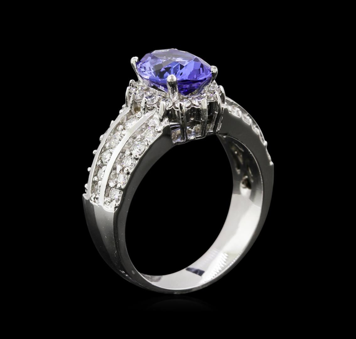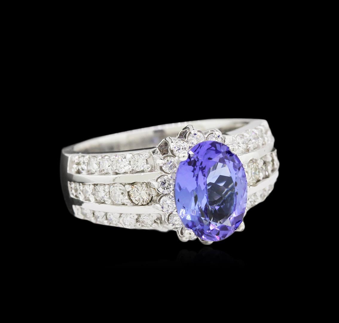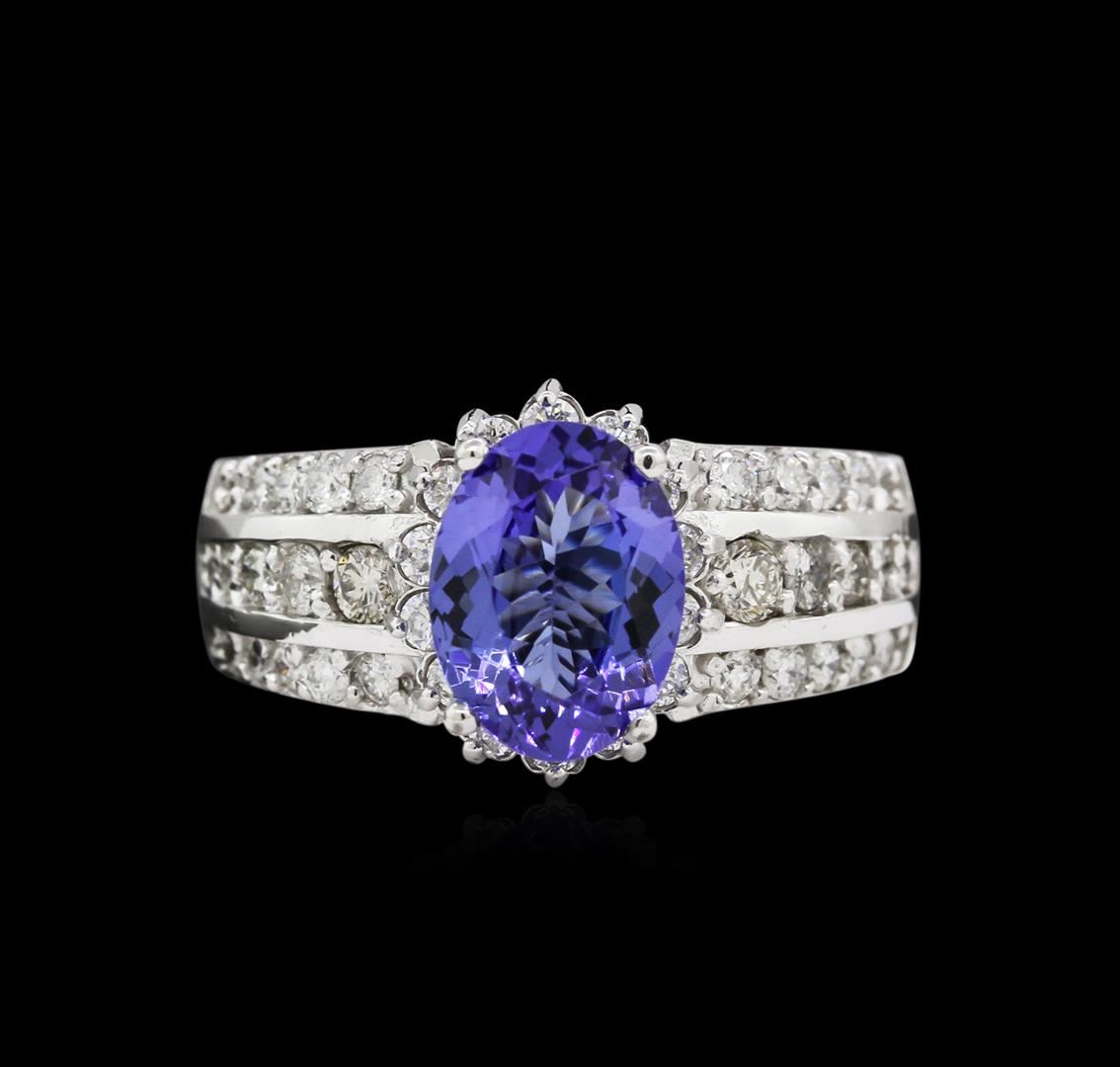 One electronically tested 14KT white gold ladies cast tanzanite and diamond ring with a bright polish finish. Identified with markings of "K14". Condition is new. Containing: One prong set oval modified brilliant cut natural tanzanite, measuring 9.90 x 7.40 x 4.81mm, approximate weight of 2.48ct., clarity is eye clean, type I, medium light, very slightly grayish, violet color, (GIA V 4/3), cut is good. Forty-Four prong set round brilliant cut diamonds, measuring 2.20 - 1.50 x 1.11mm (depth est.) approximate total weight of 44 Stones = 0.80ct. Clarity: SI-2 to I-1. Color: I - K, Cut is Good. Colored gemstones are presumed to have been subjected to commonly used enhancement processes. All diamonds and colored gemstones are graded in the mounting, unless otherwise stated. Total Weight of Colored Stones 2.48ct. Total Weight of Diamonds 0.80ct. Total Weight of Ring 8.30 grams. GGL Appraised at $5,575.00.