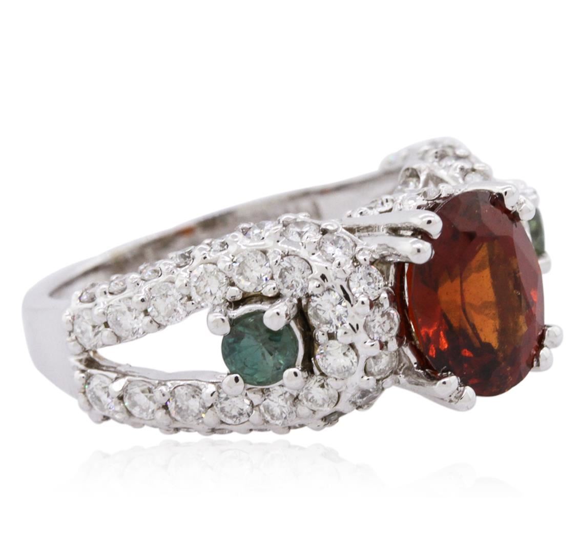One electronically tested 14KT white gold ladies cast garnet, alexandrite and diamond ring with a bright polish finish. The featured garnet is supported by diamond set split shoulders with alexandrite accents, completed by a one and one-half millimeter wide band. Identified with markings of "14K". Condition is new, good workmanship. Containing: One prong set oval brilliant cut natural pyrope garnet, measuring 8.90 x 7.30 x 4.80mm, 6%. bulge factor, approximate weight of 2.49ct., clarity is slightly included, dark, very slightly brownish, reddish orange color, (GIA rO 7/3), cut is good. Transmitting light with a minimum of distortion, transparent. Naturally occurring internal & external characteristics are present. Refractive index testing results of 1.74. This is a conclusive result for pyrope garnet. Graded in the setting. Two prong set round brilliant cut natural alexandrites, measuring 3.10 - 3.10 x 2.02 mm, approximate total weight of 0.30ct., clarity is slightly included, type II, medium dark, slightly grayish, very slightly bluish green color, (GIA vslbG 6/2) to medium light, very slightly grayish, slightly purplish red, (GIA slpR 4/3), cut is good. Transmitting light with a minimum of distortion, transparent. Naturally occurring internal & external characteristics are present. Color grade is an average for the pair. Graded in the setting. Alexandrite was discovered in the 1830's near the Tokovaya River in the Ural Mountains of Siberian Russia. It later became the national gemstone of Russia. The name "alexandrite" became official in 1842.Alexandrite is a variety of chrysoberyl. It contains both beryllium and chromium. It is the chromium that accounts for the spectacular color change. The color change is the primary qualification for a chrysoberyl to be considered alexandrite. Alexandrite is strongly trichroic. Its color change results in a near-equal transmission of the blue-green and red portions of the spectrum, coupled with strong absorption in the yellow. Today Alexandrite is found in Brazil, India, Madagascar, Myanmar, Russia, Sri Lanka, Tanzania and Zimbabwe. Seventy-Four prong set round brilliant cut diamonds, measuring 1.90 - 1.70 x 1.08mm (depth est.) approximate total weight of 74 Stones = 1.67ct. Graded in the setting. Clarity: SI-1 to I-1. Color: G - I. Total Weight of Colored Stones 2.79ct. Total Weight of Diamonds 1.67ct. Total Weight of Ring 7.52 grams. AIG Appraised at $6,535.00.